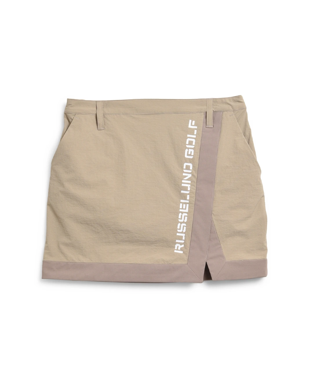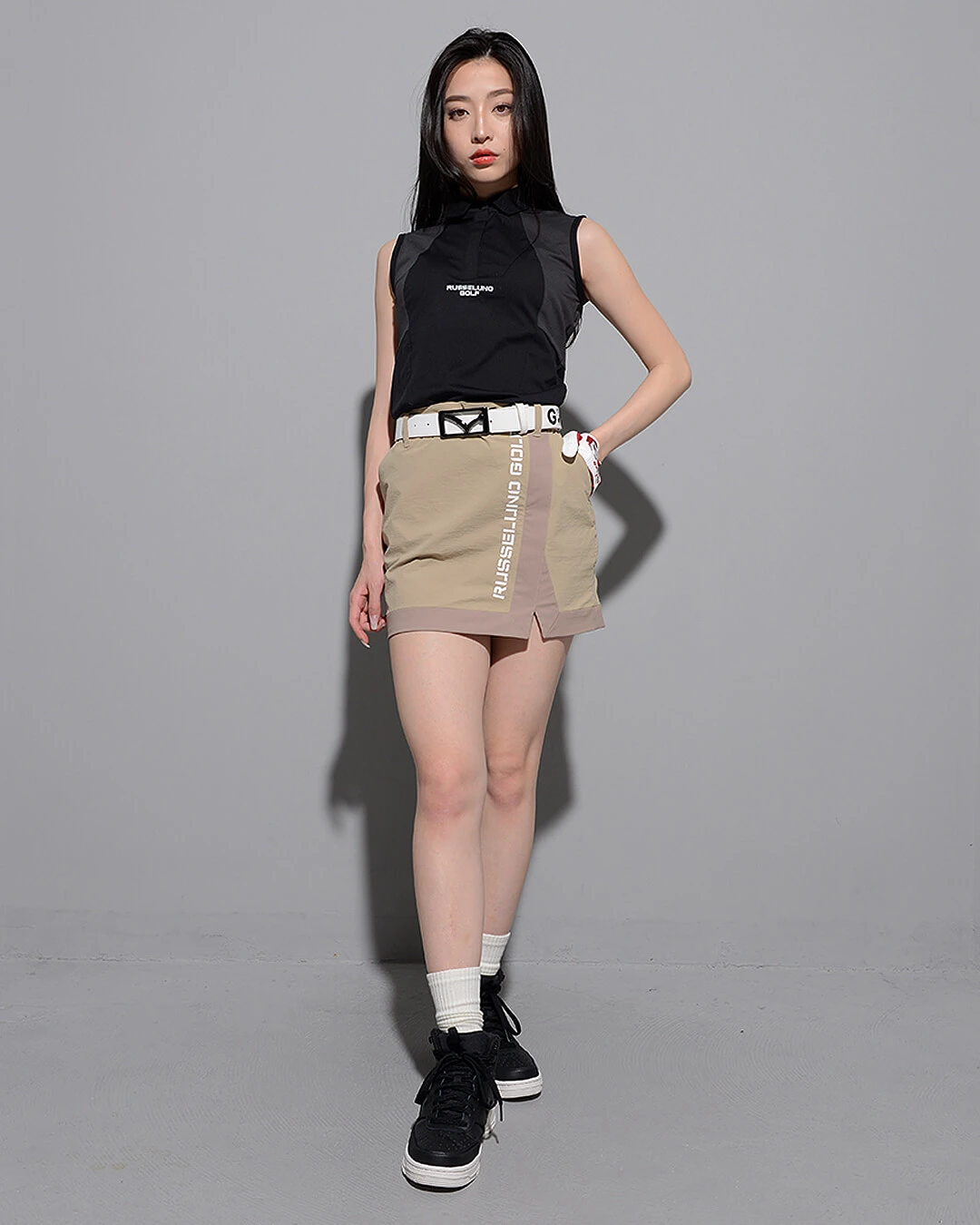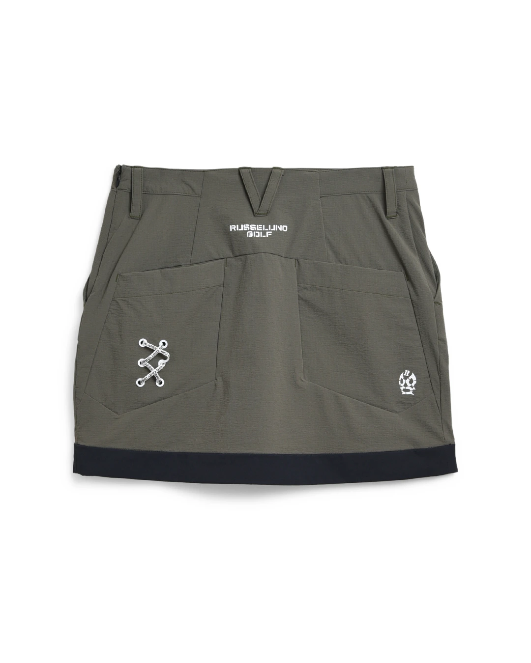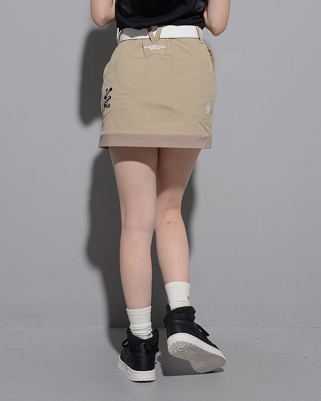 裾のトリミングをポイントにフロントのスカート端に隠れるロゴがラウンド時の動きの変化によって見え方が変わります。