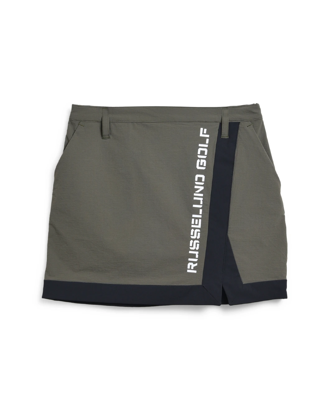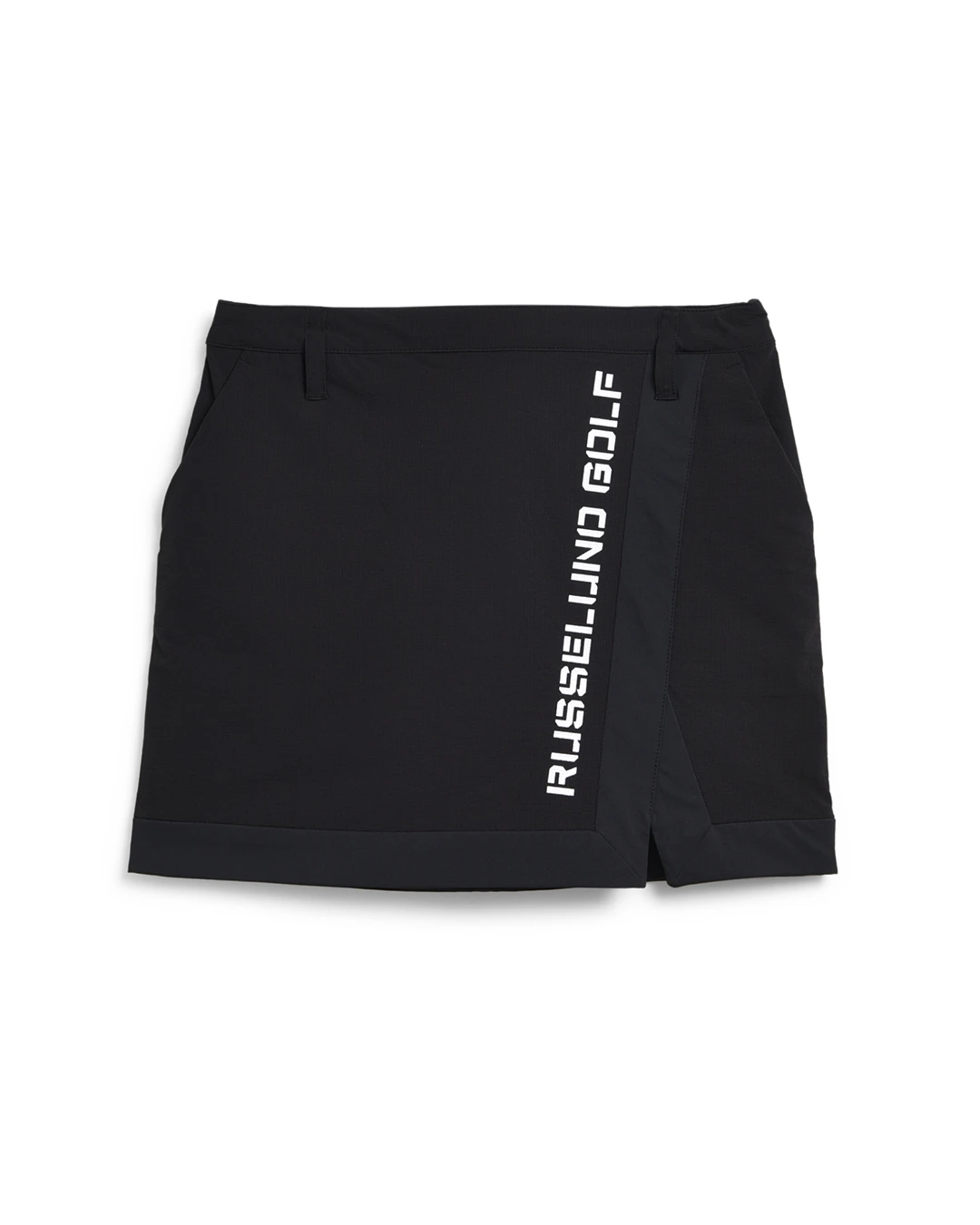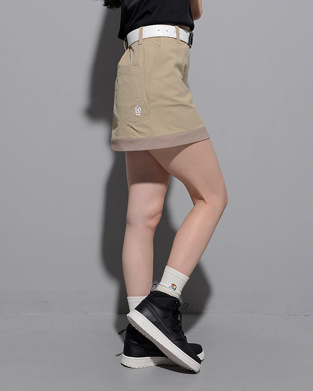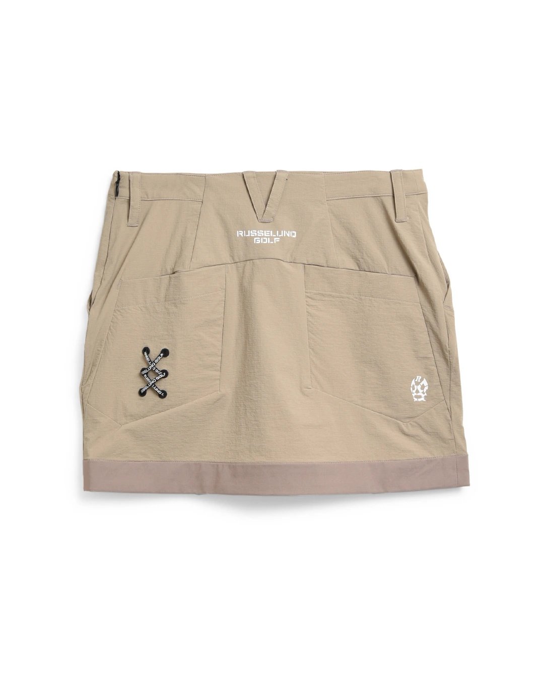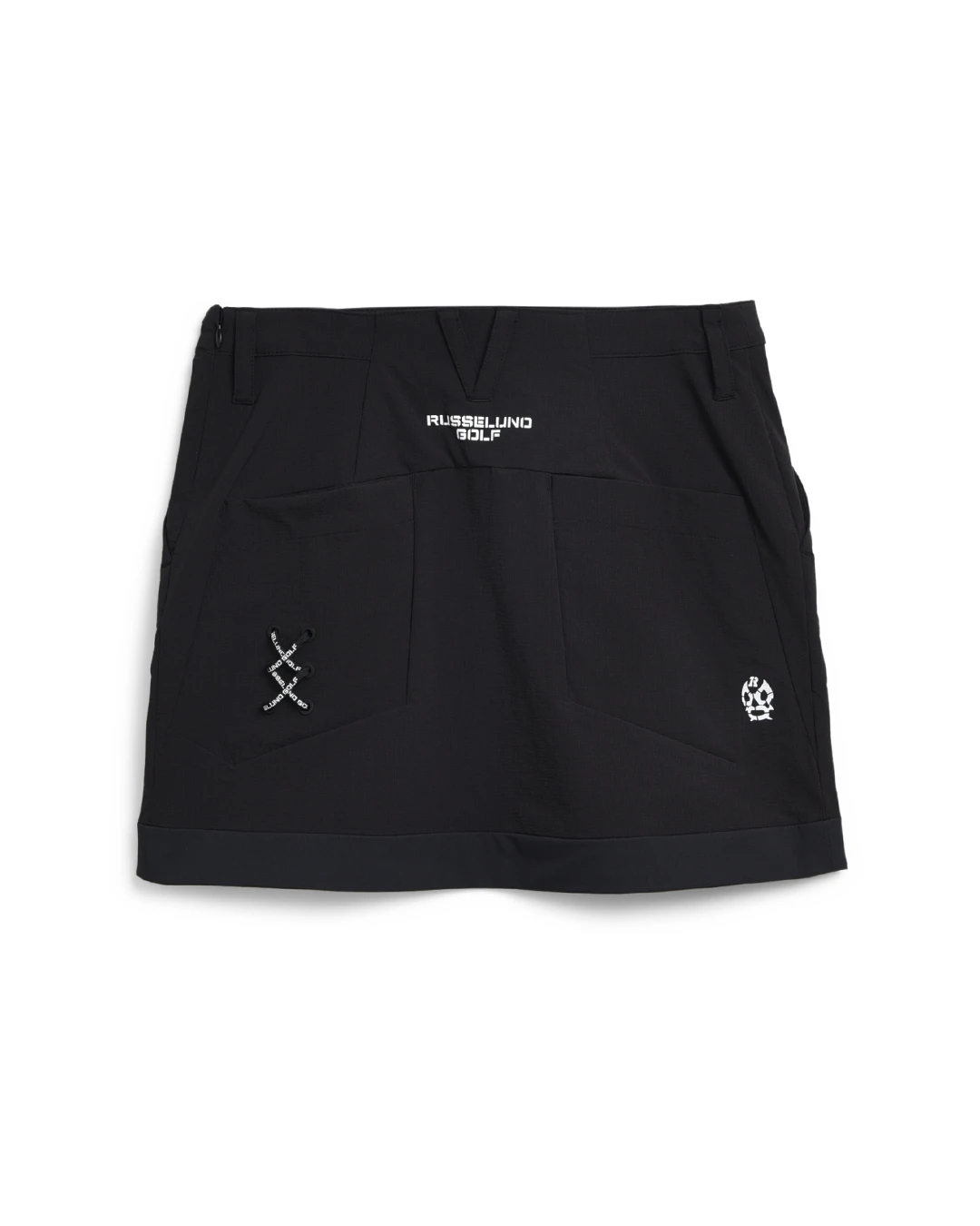 裾のトリミングをポイントにフロントのスカート端に隠れるロゴがラウンド時の動きの変化によって見え方が変わります。