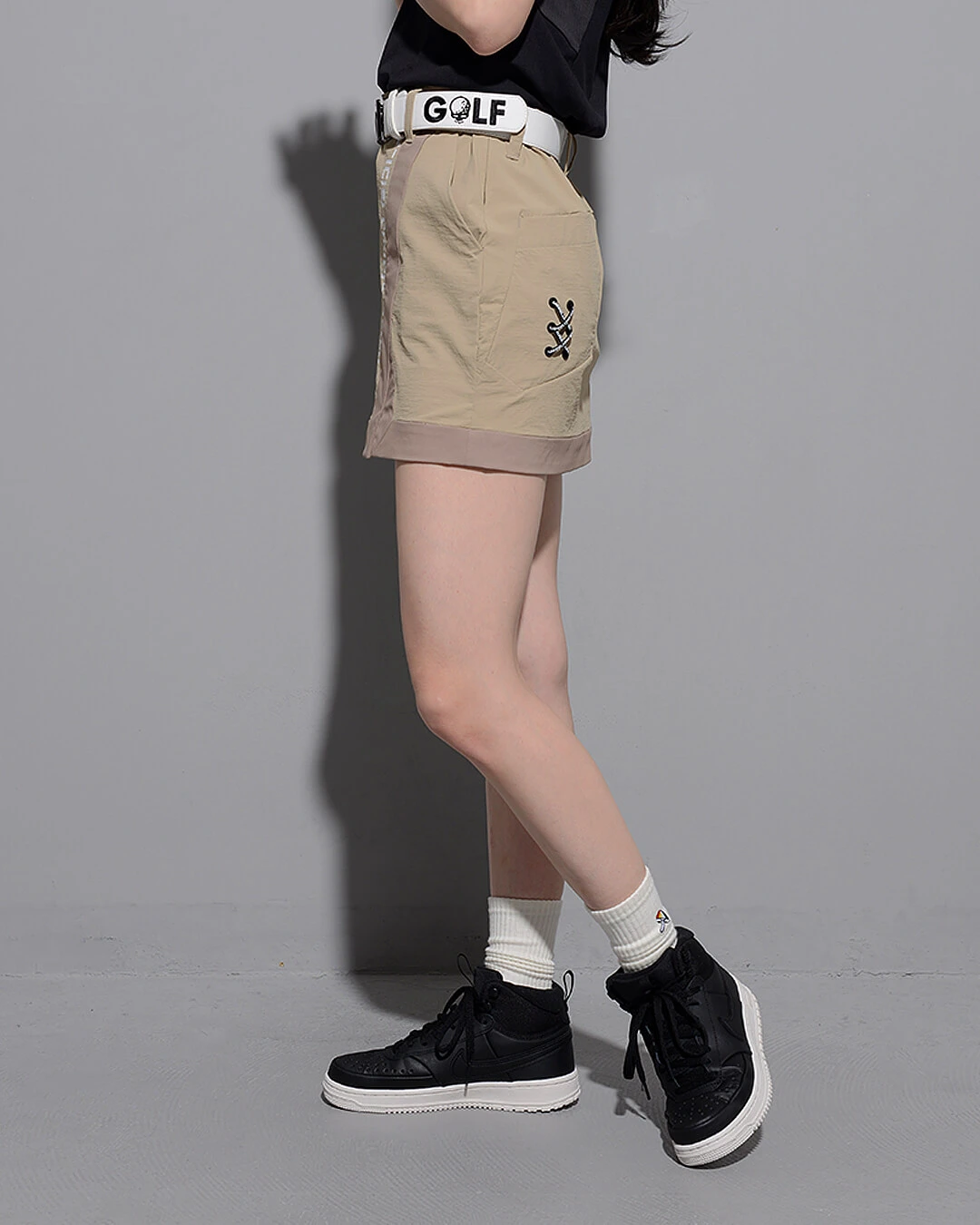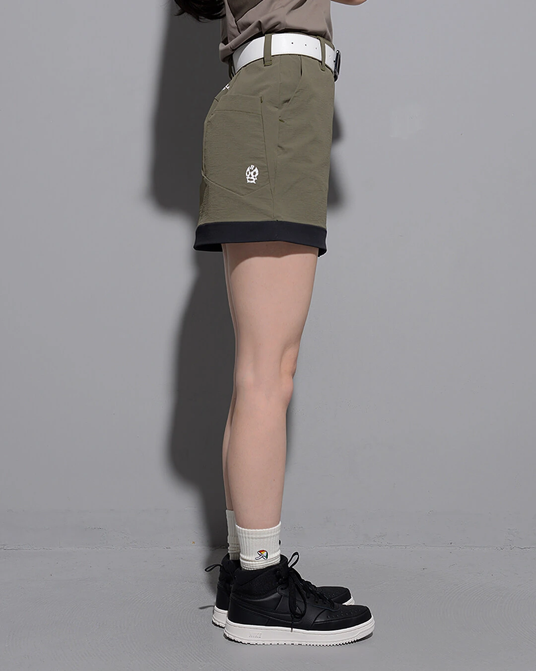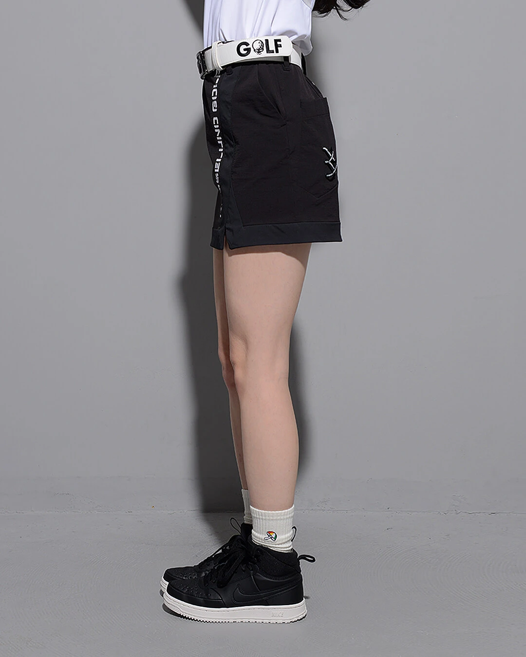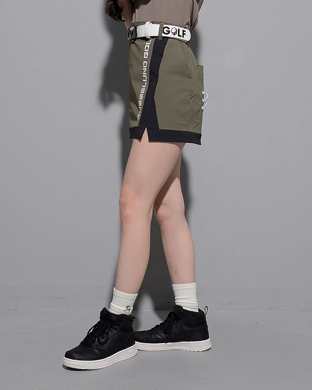 裾のトリミングをポイントにフロントのスカート端に隠れるロゴがラウンド時の動きの変化によって見え方が変わります。