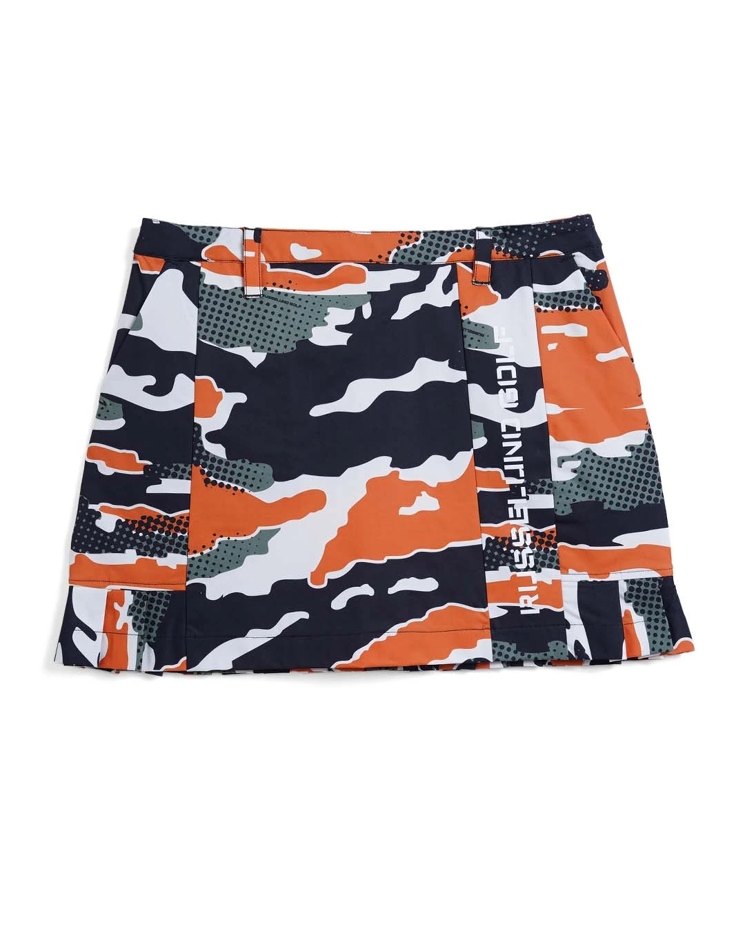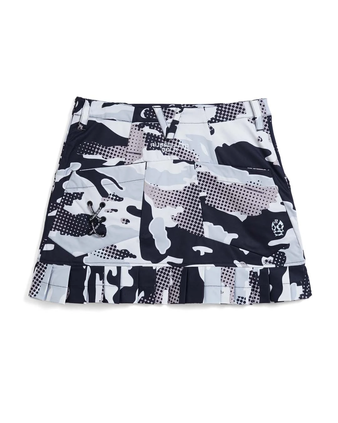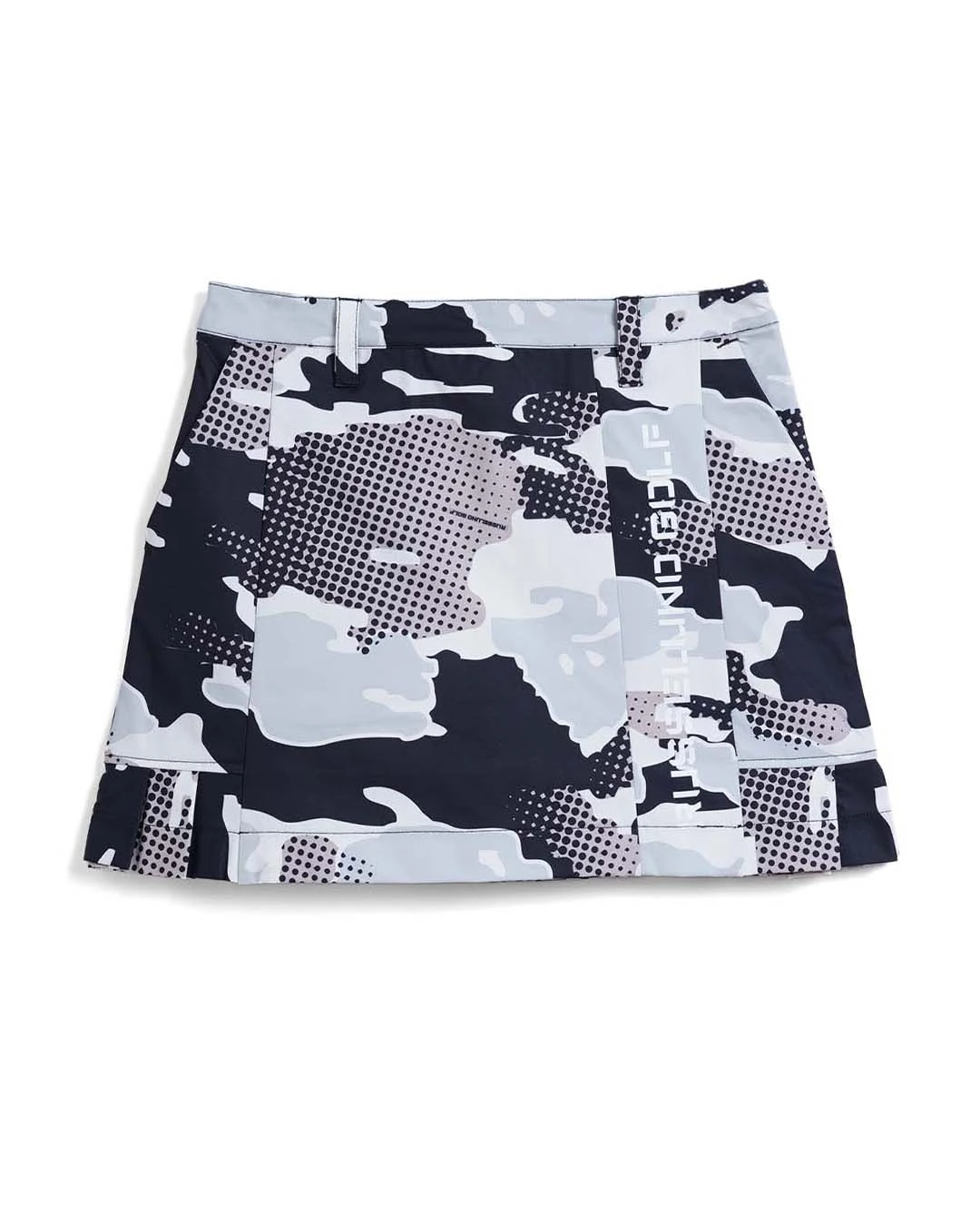 カモ柄を施したボディーに黒で締めたトリミングにロゴをプラスし単調なデザインになりがちなスカートを、女性らしくデザイン。