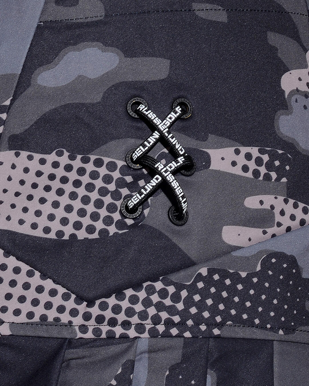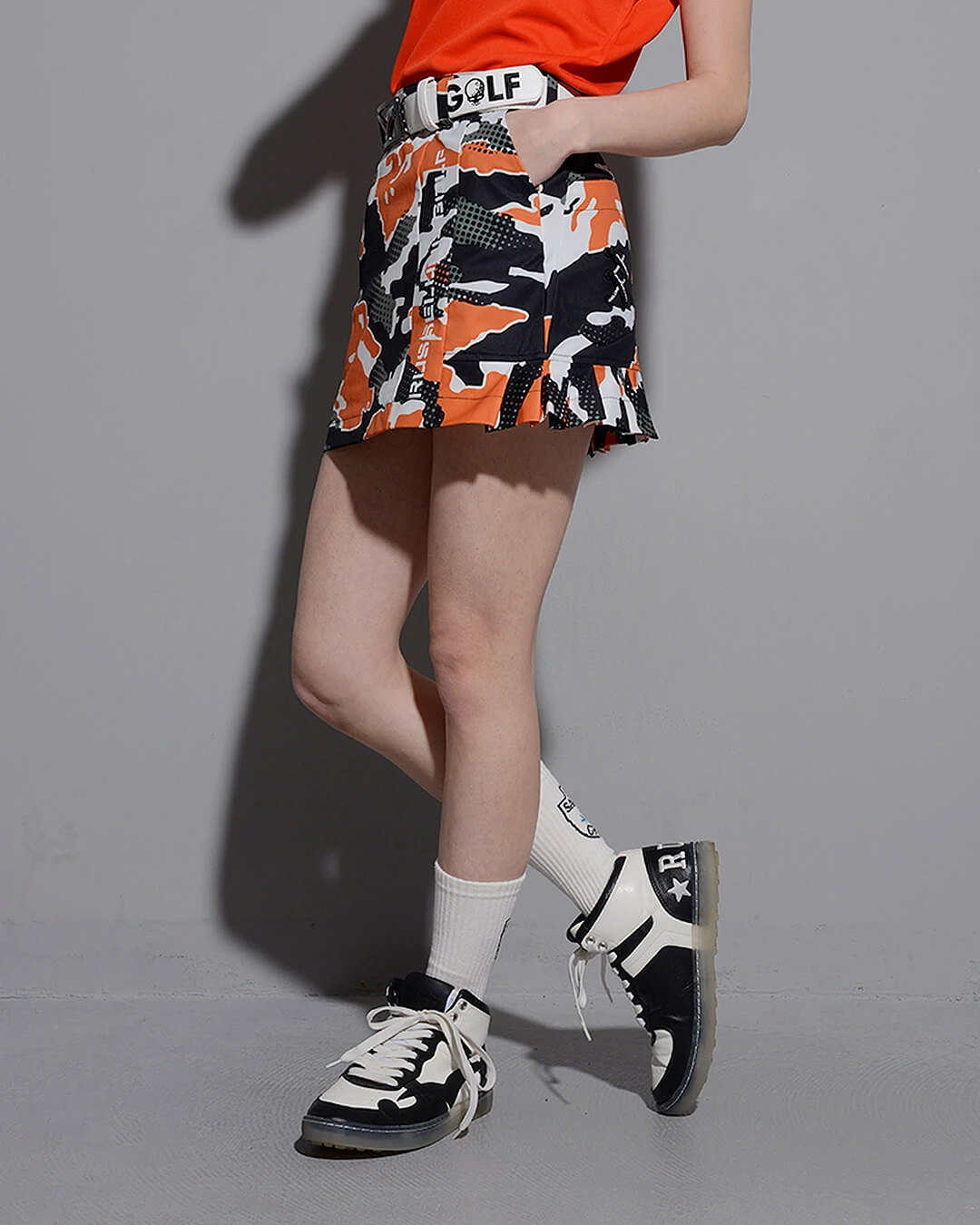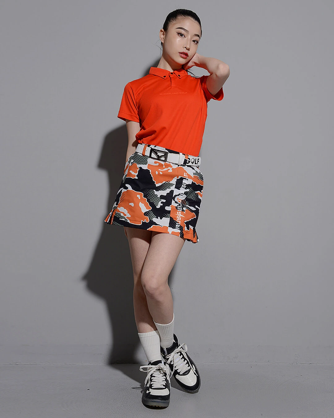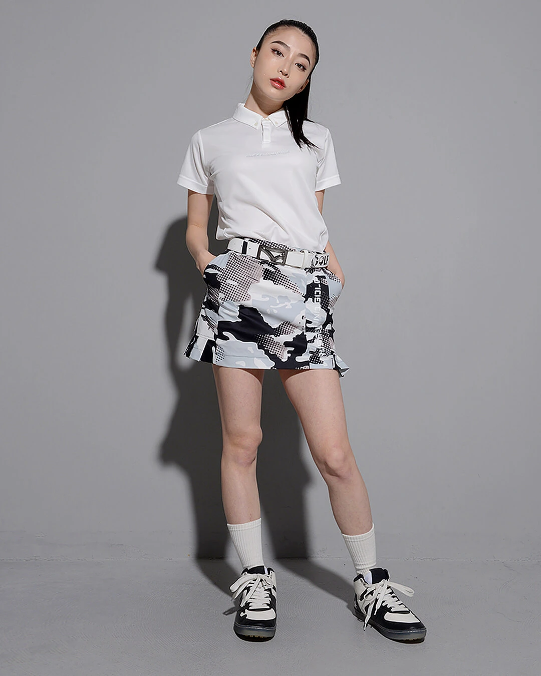 カモ柄を施したボディーに黒で締めたトリミングにロゴをプラスし単調なデザインになりがちなスカートを、女性らしくデザイン。