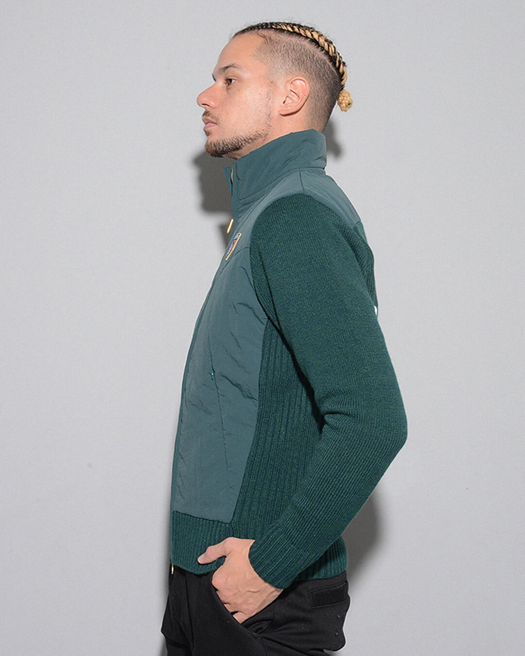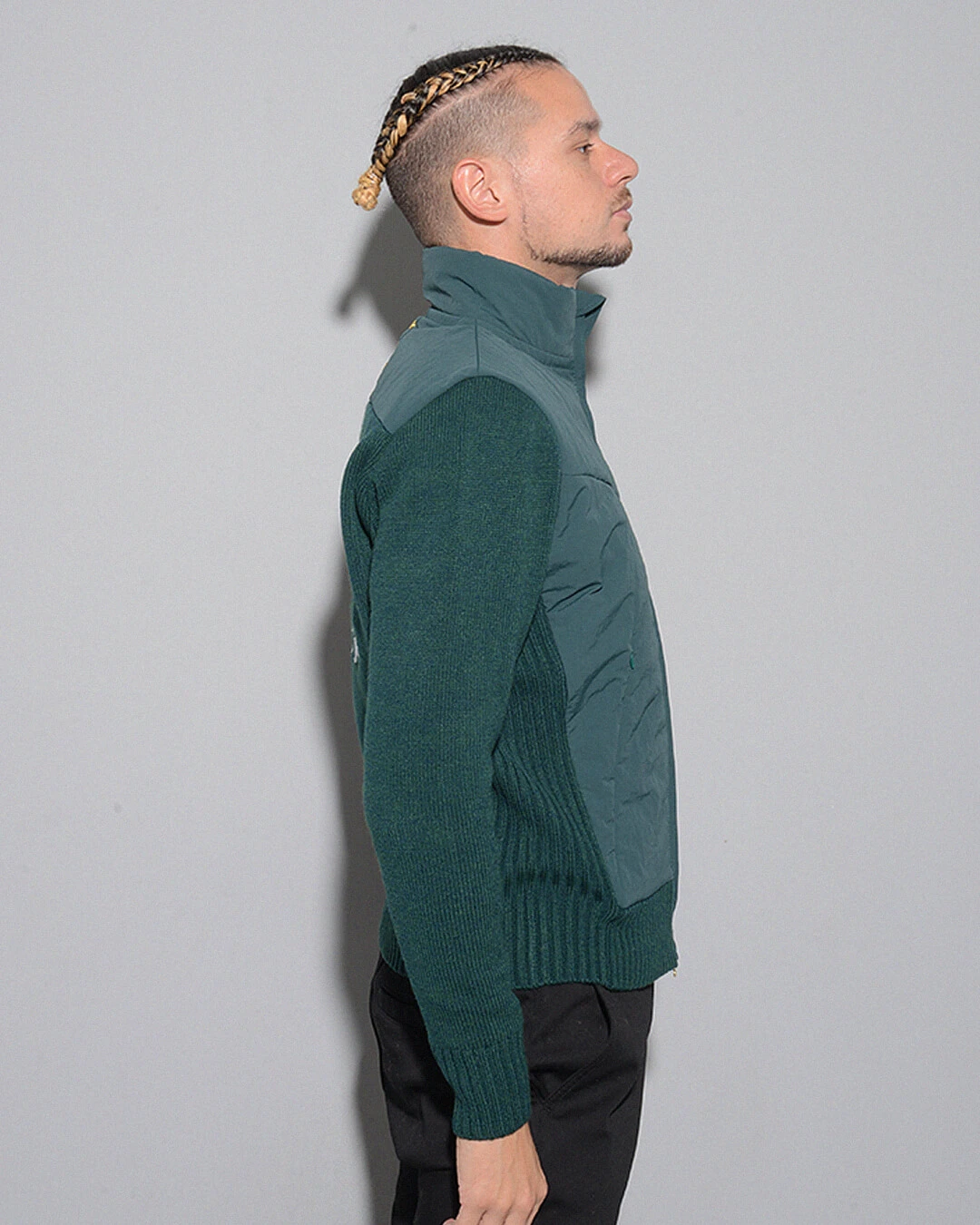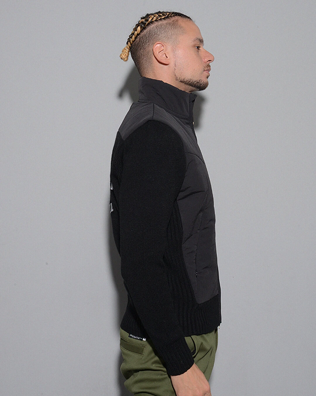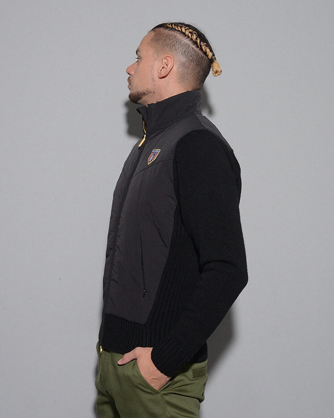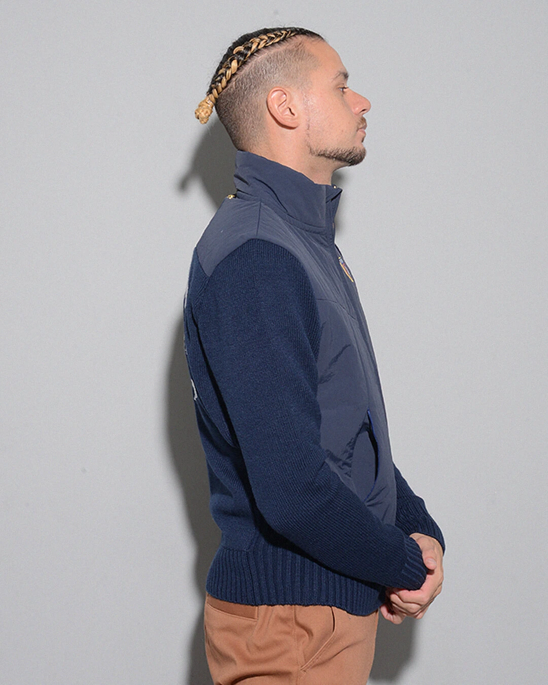 前身頃が撥水加工ナイロンの中綿仕様デザインに なった、ニットジャケットです。
