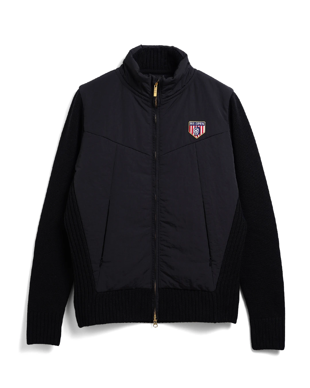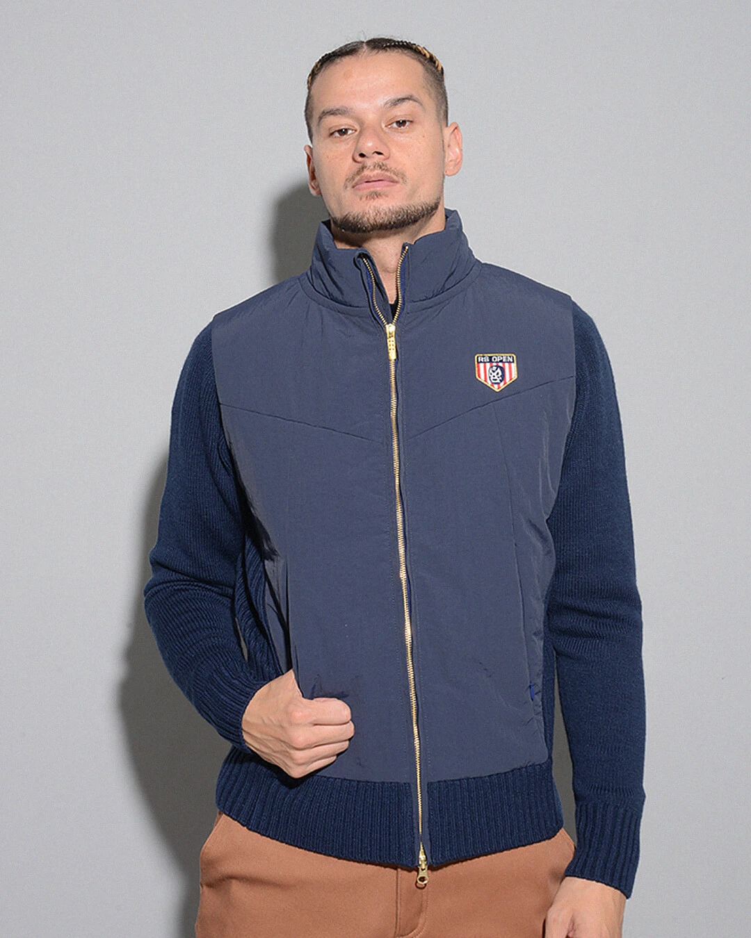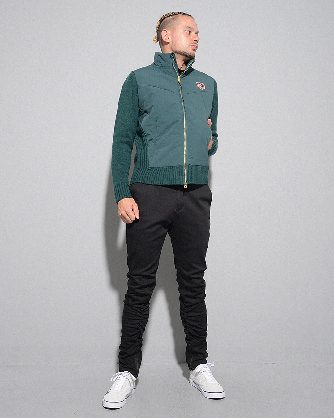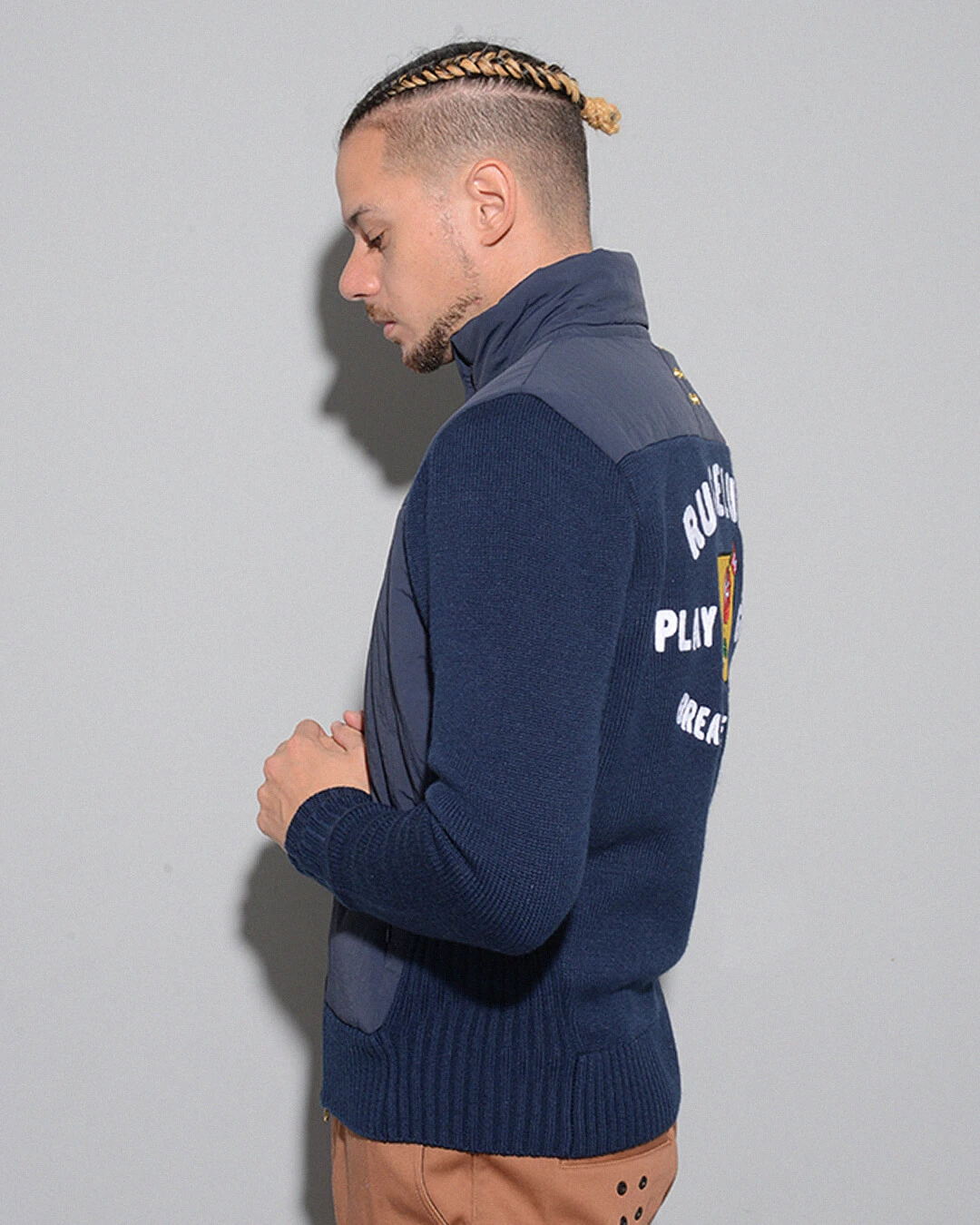 前身頃が撥水加工ナイロンの中綿仕様デザインに なった、ニットジャケットです。