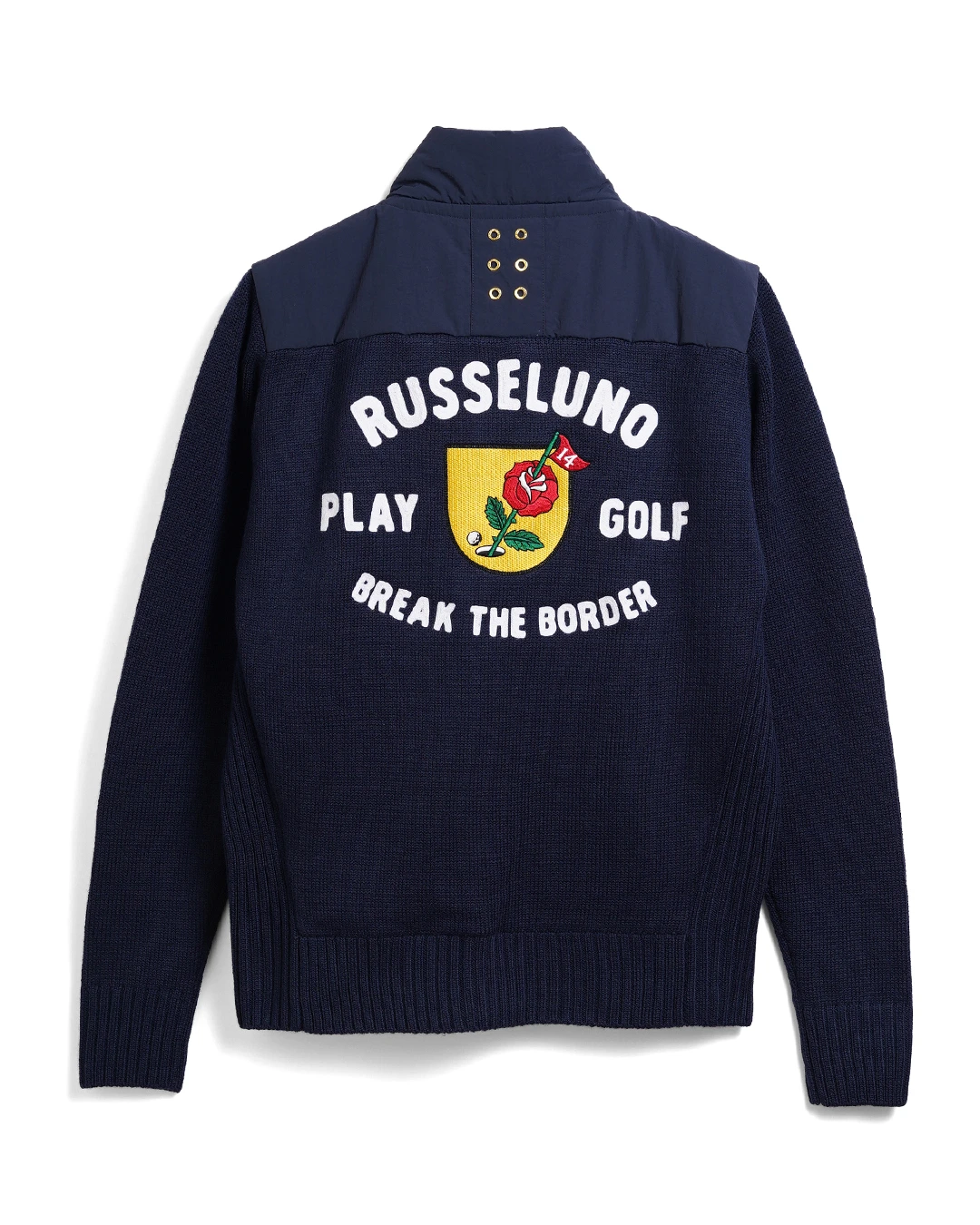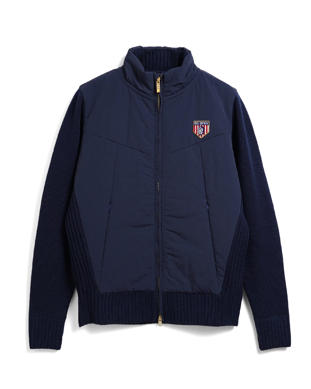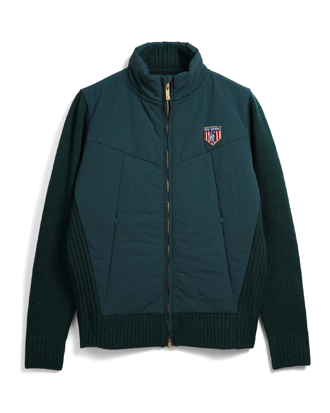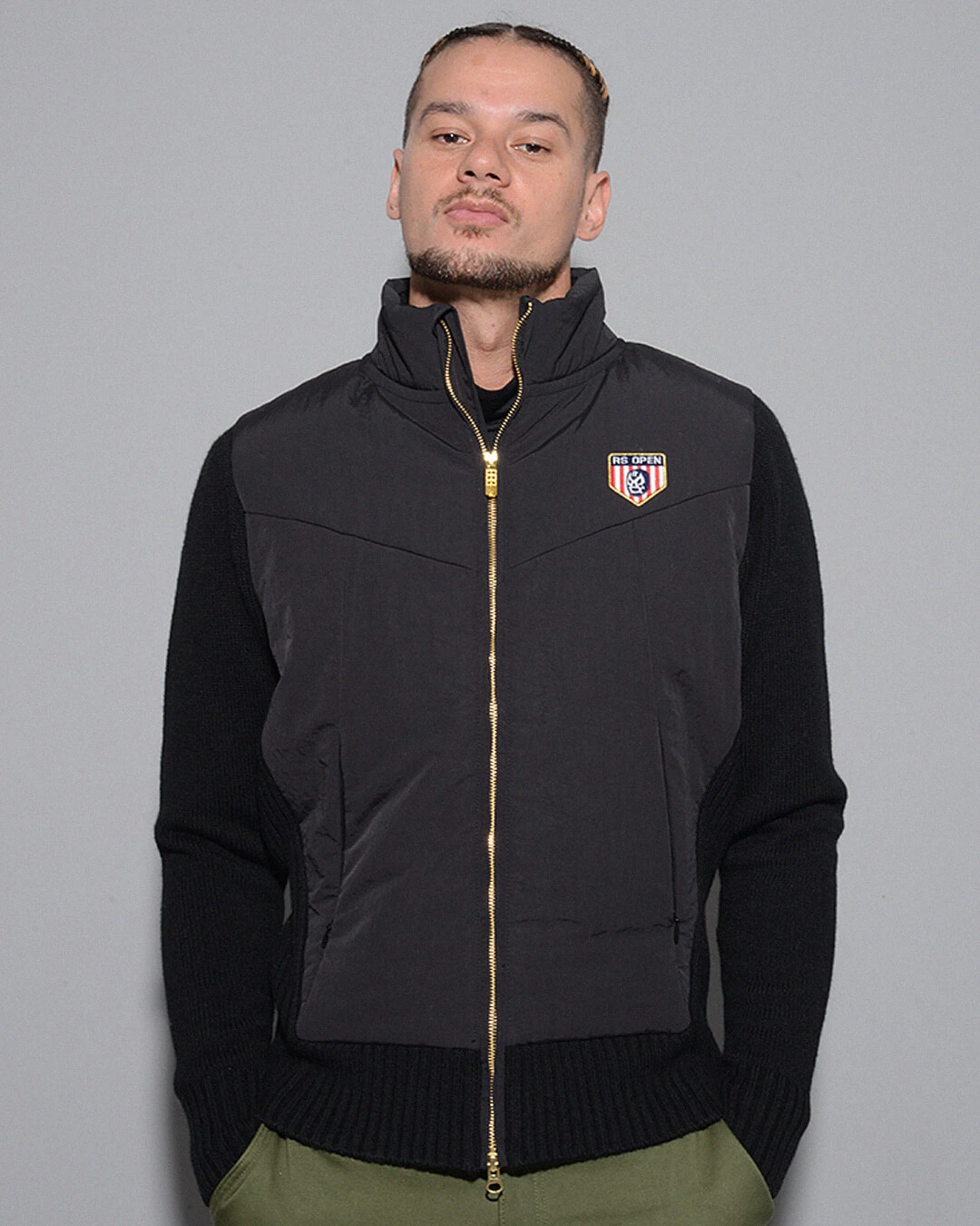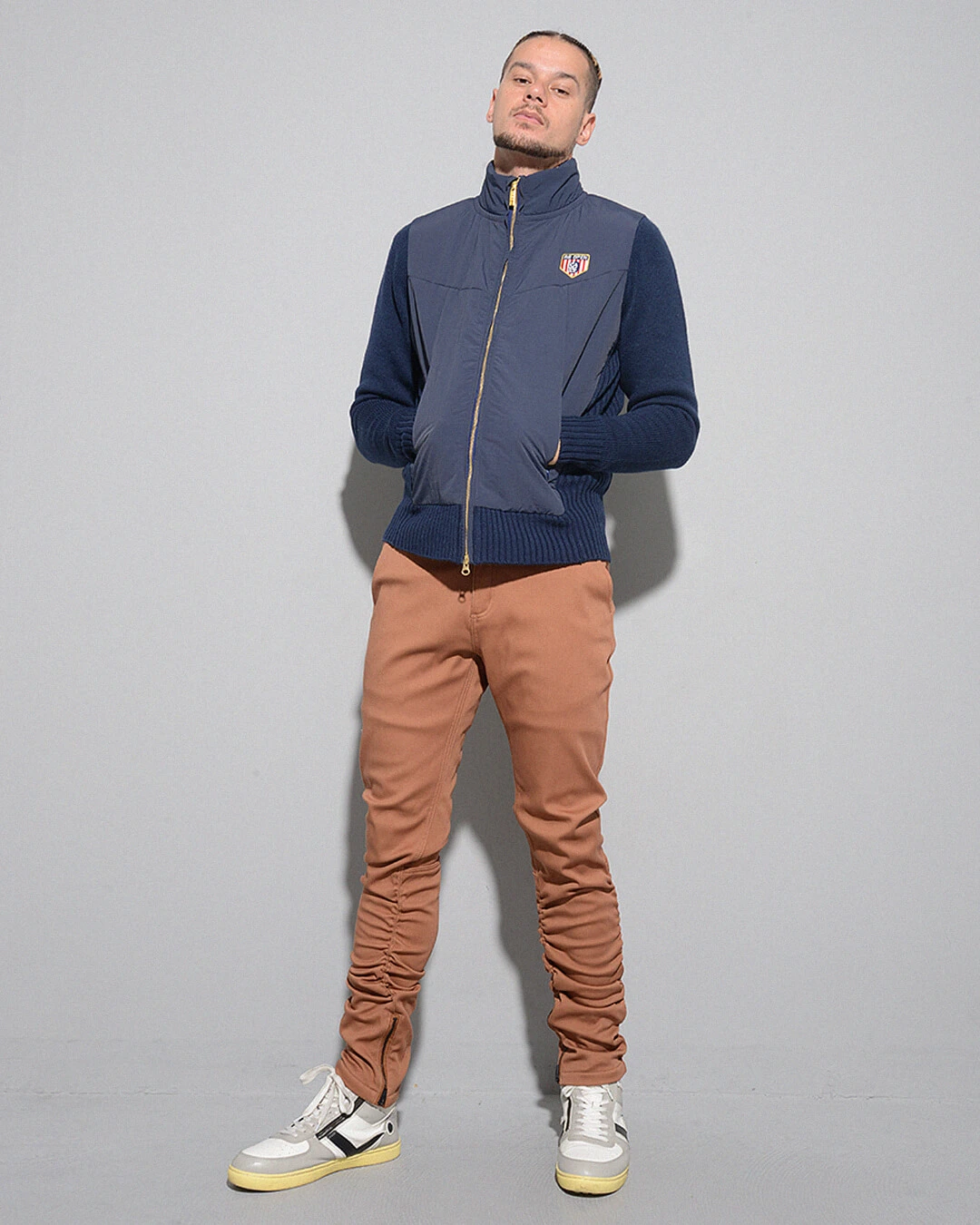 前身頃が撥水加工ナイロンの中綿仕様デザインに なった、ニットジャケットです。