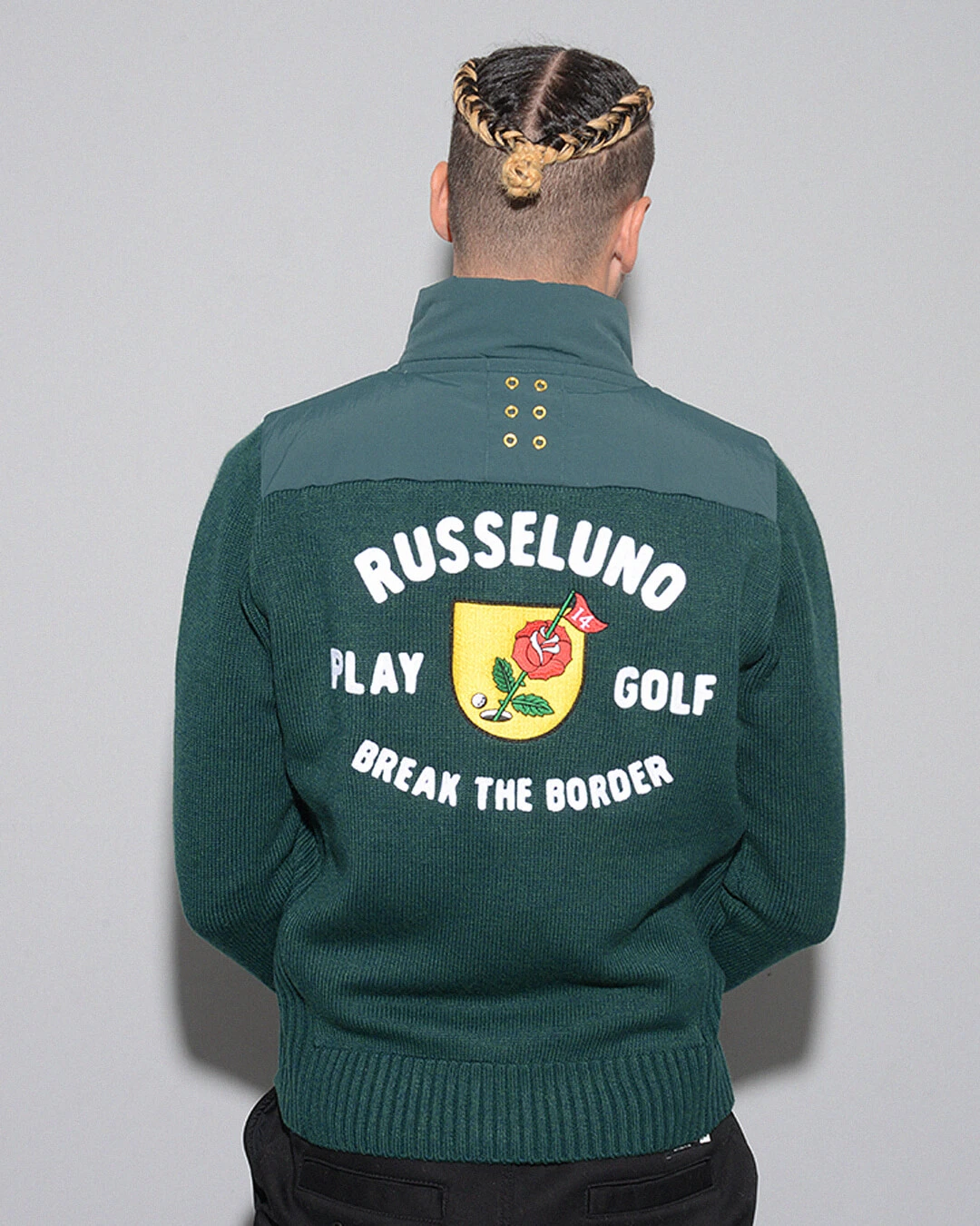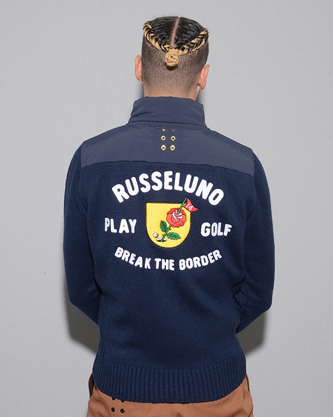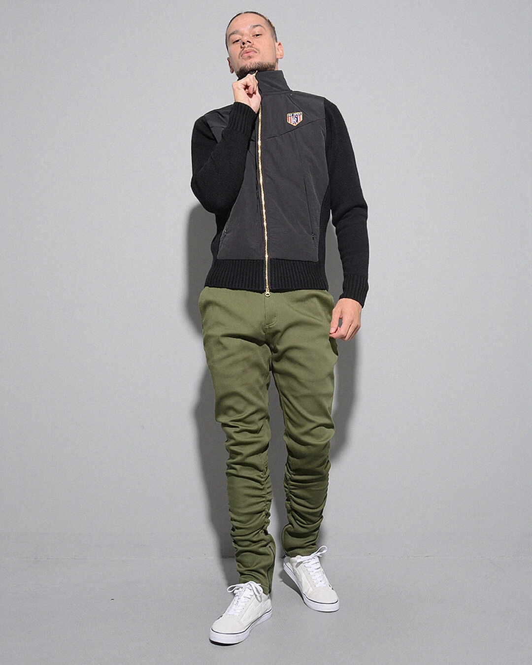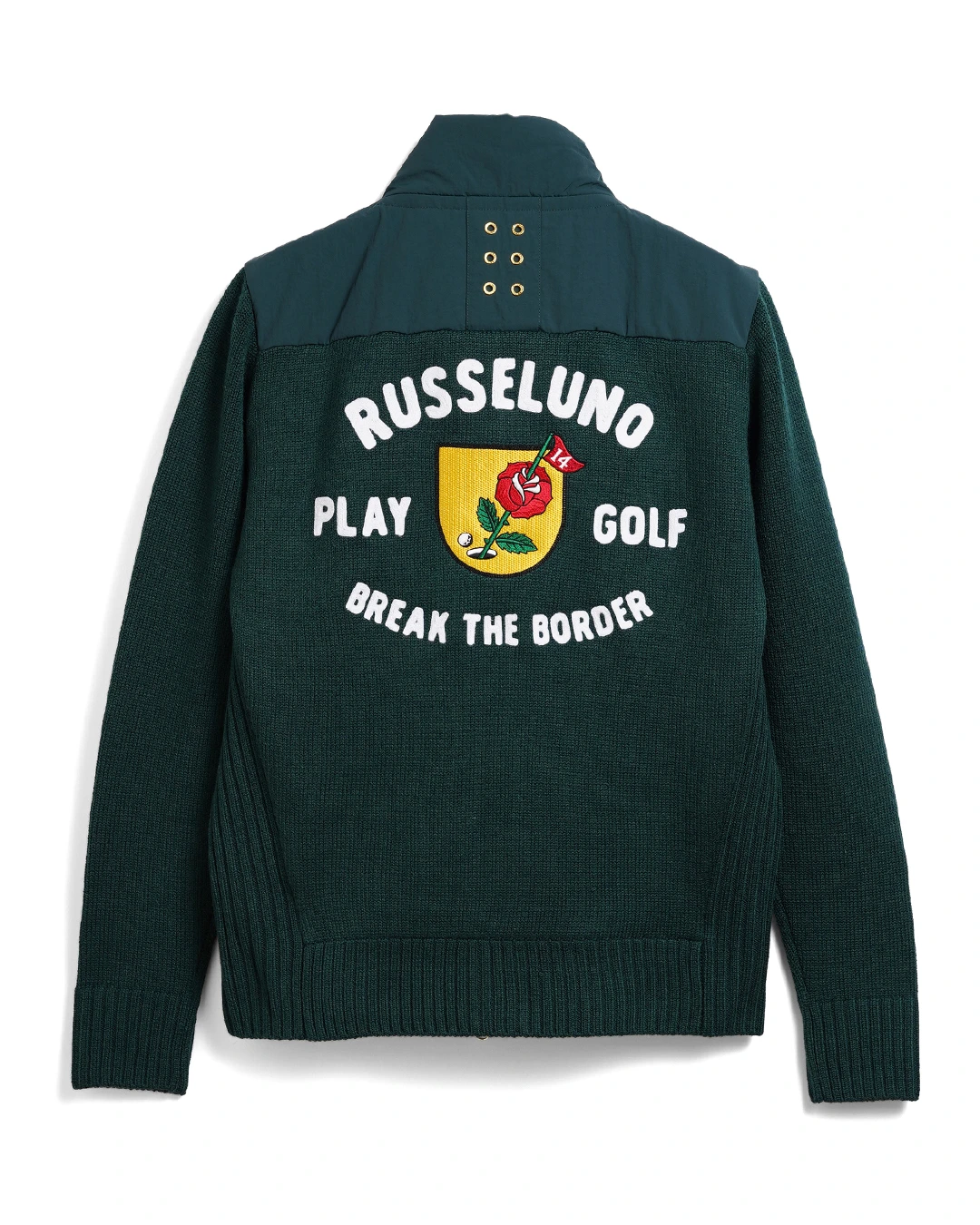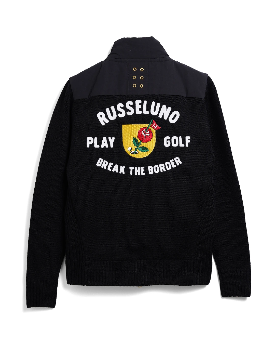 前身頃が撥水加工ナイロンの中綿仕様デザインに なった、ニットジャケットです。