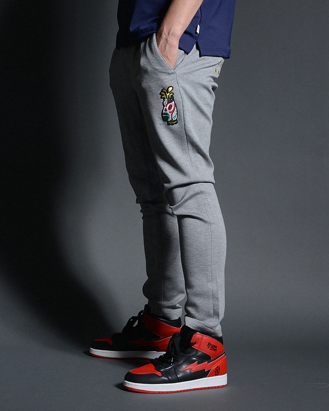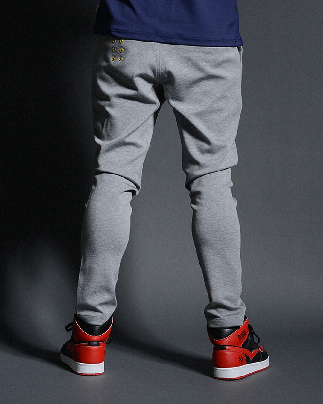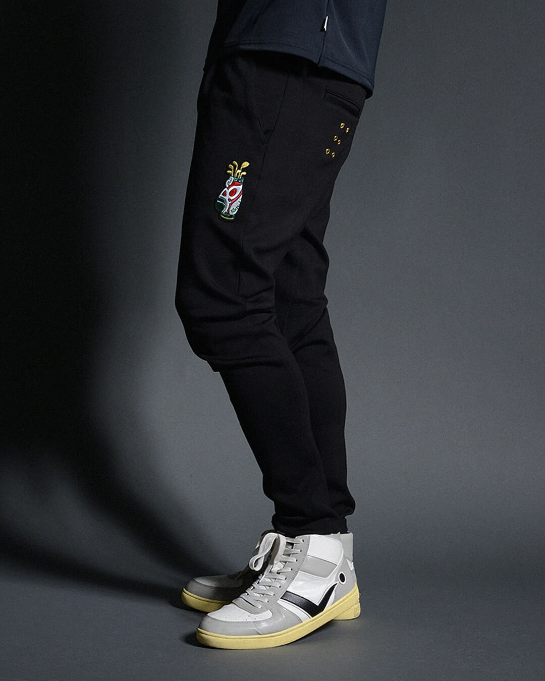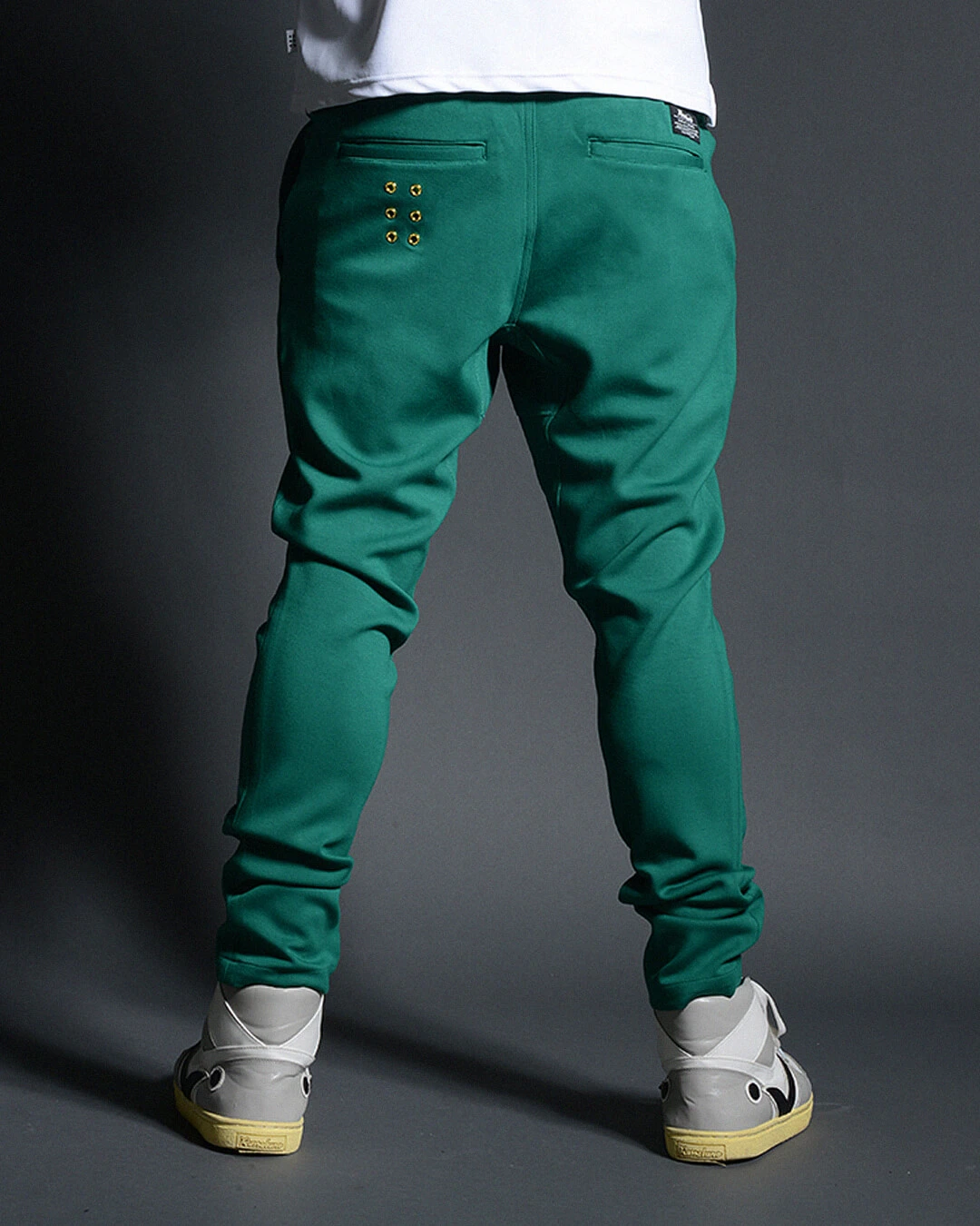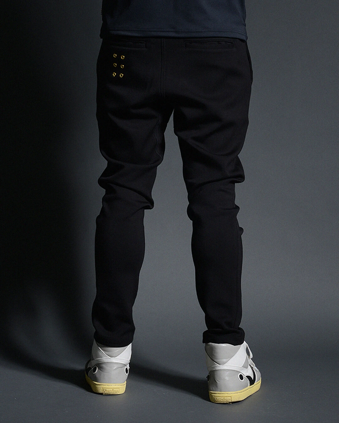 左後ポケット下には、ブランドアイデンティティー の6ホールアイレットデザインを配しています。