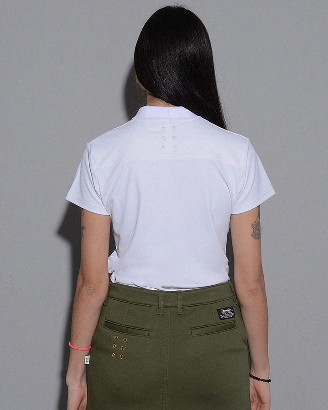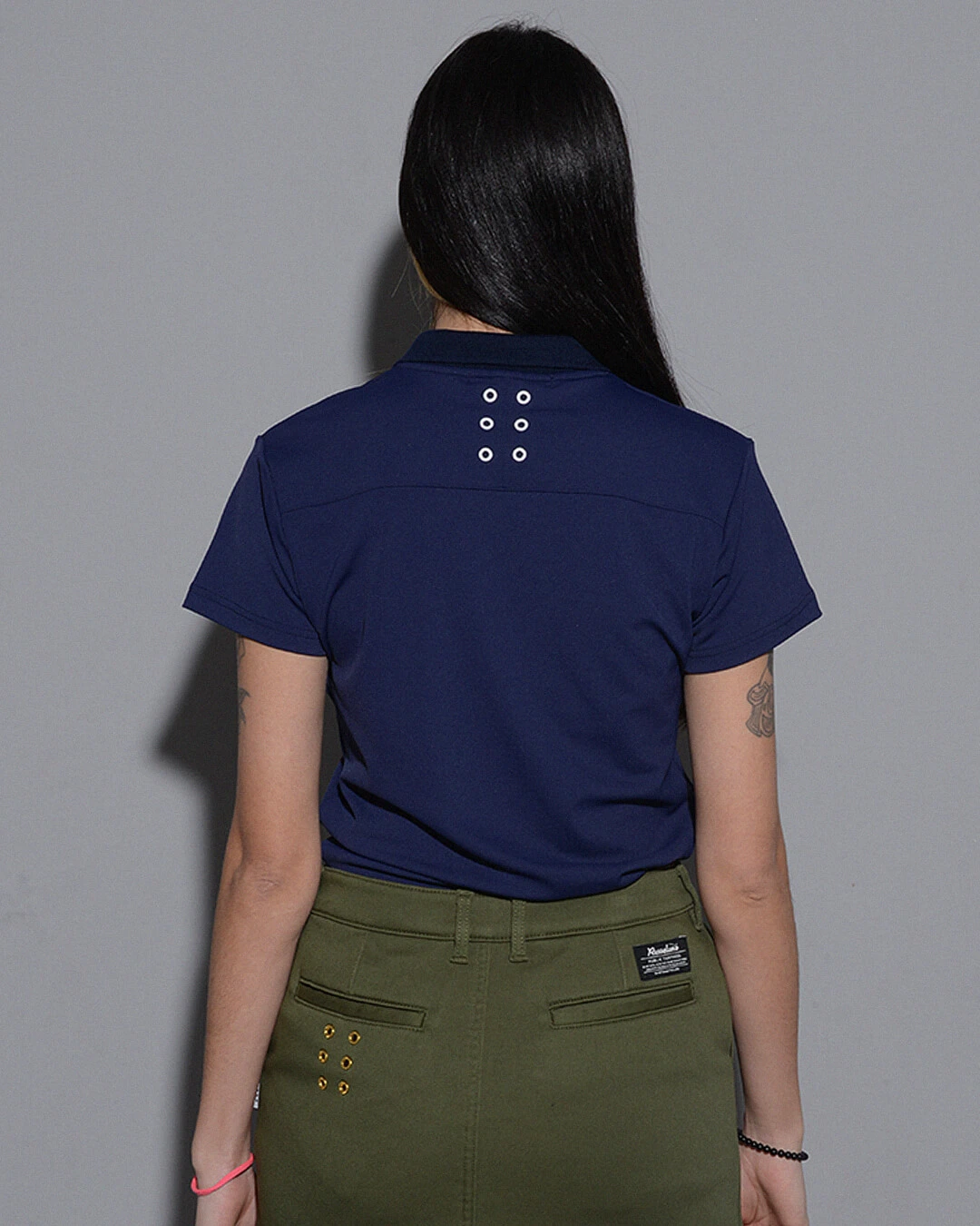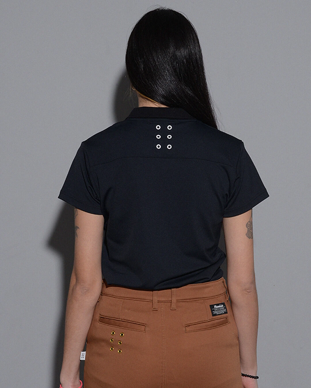 背中には、オリジナルアイレットを使用した、ブランドアイデンティティーの6ホールアイレットデザインを配しています。