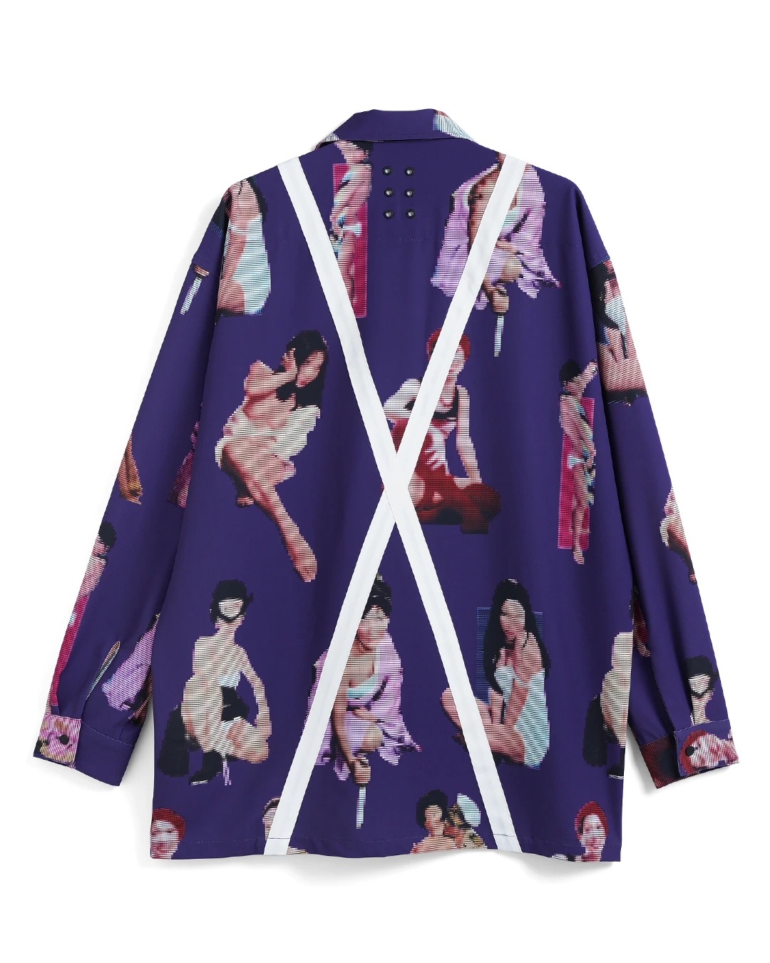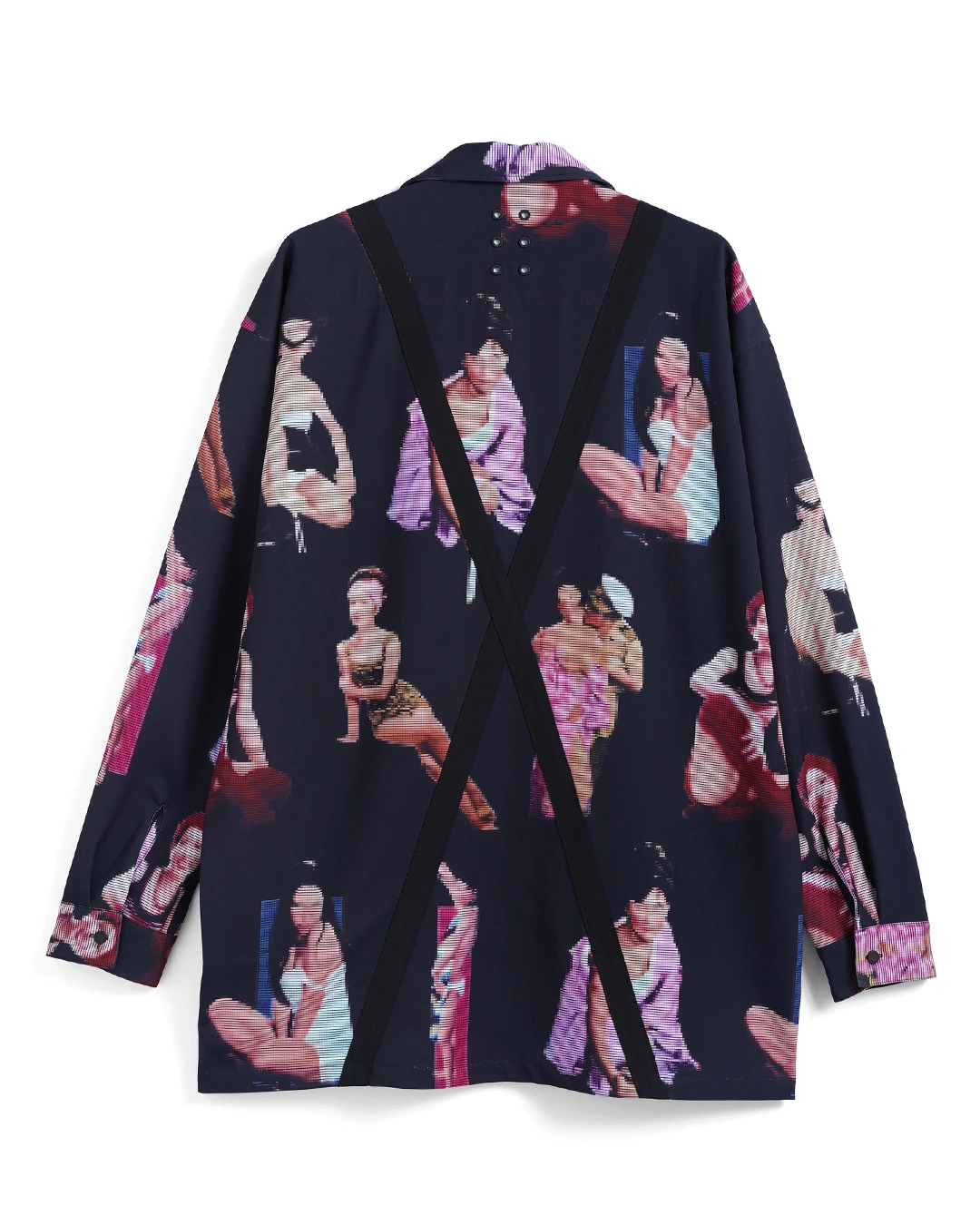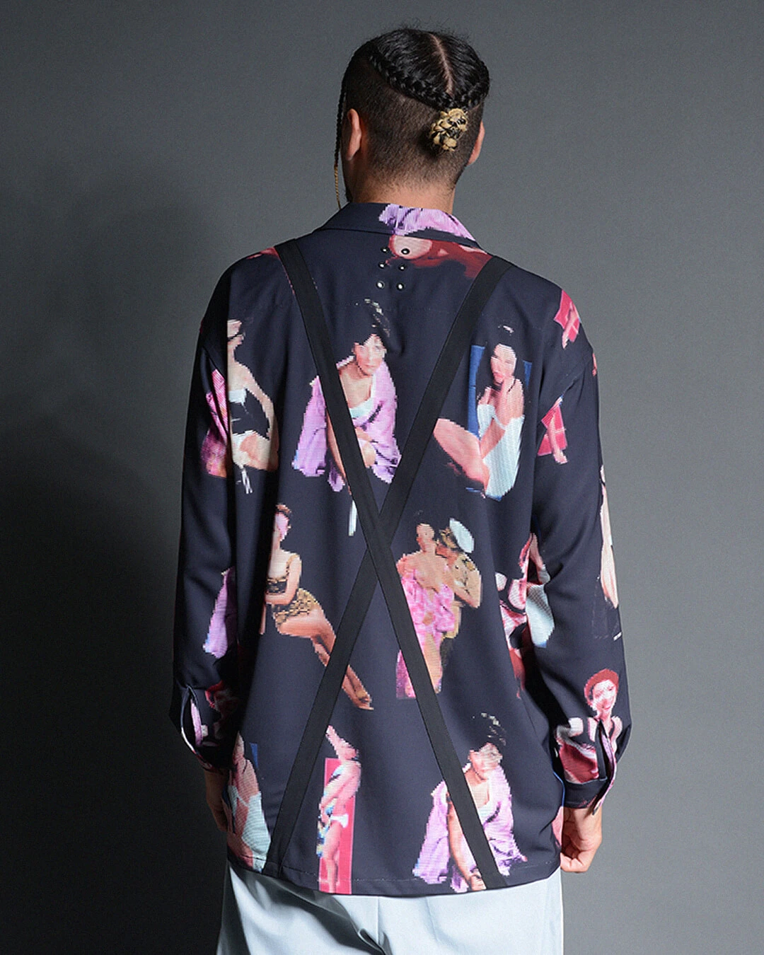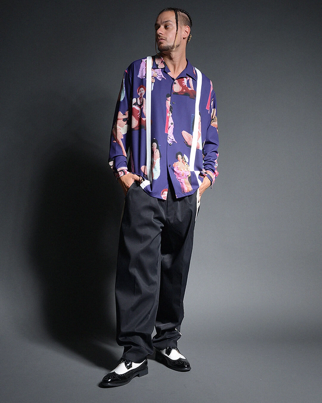 フェイクサスペンダーデザインのロングスリーブシャツ。