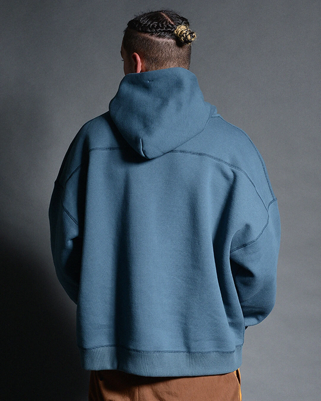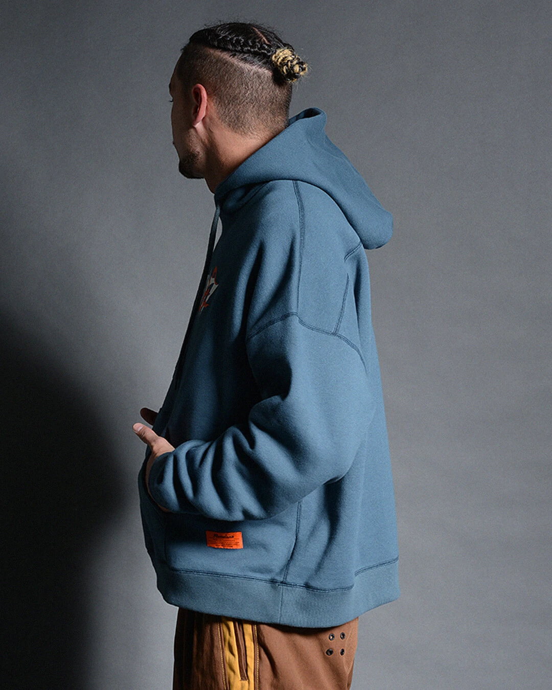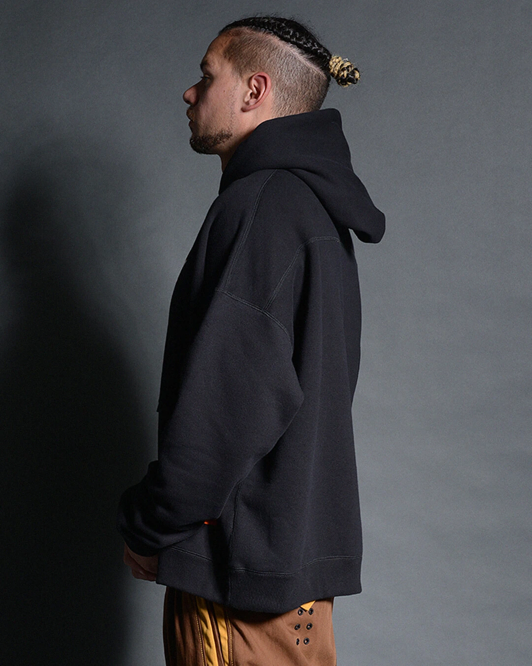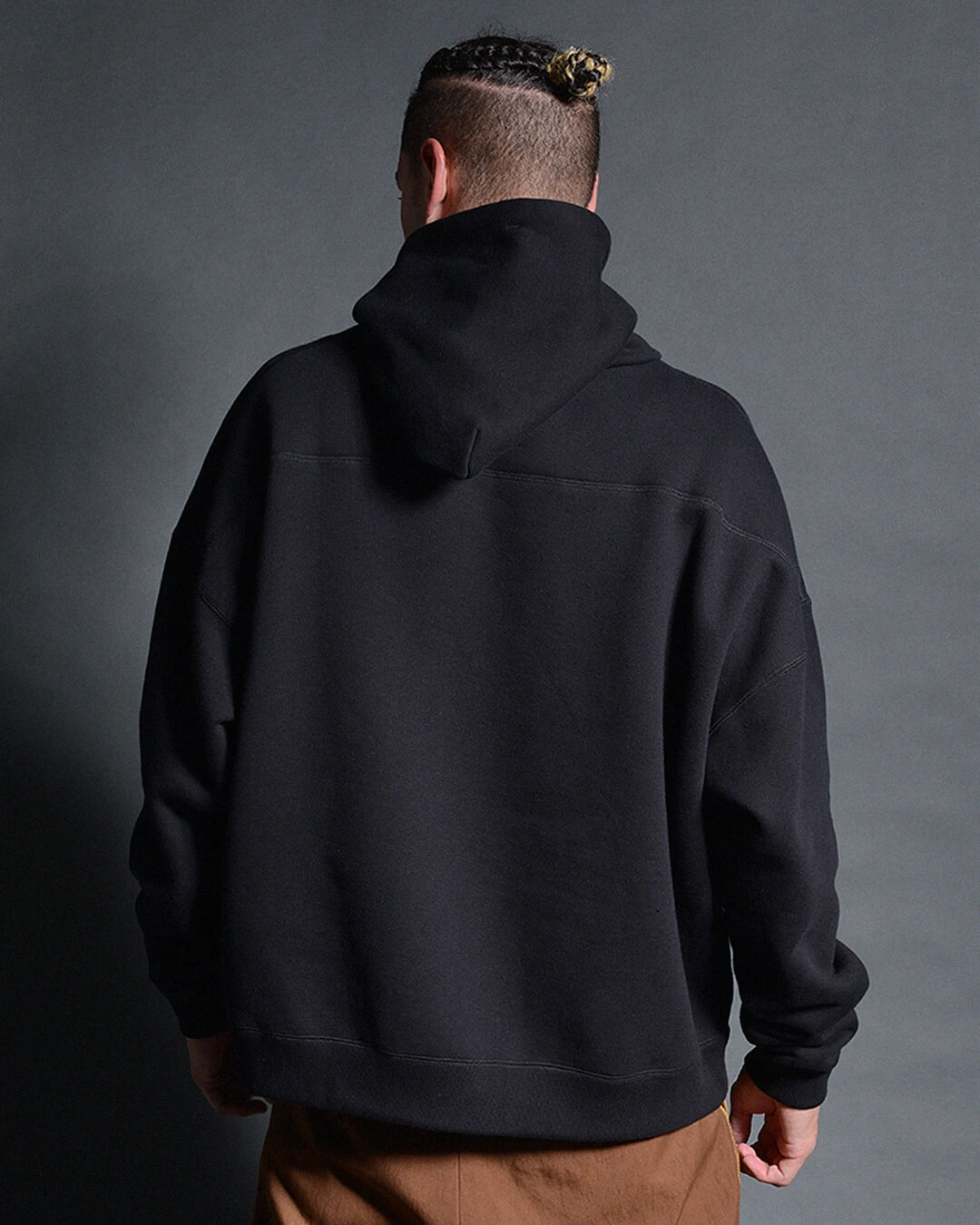 ヘビーオンスながらも、軽量なこだわりの裏起⽑スウェットをボディーに採⽤したフードパーカー。