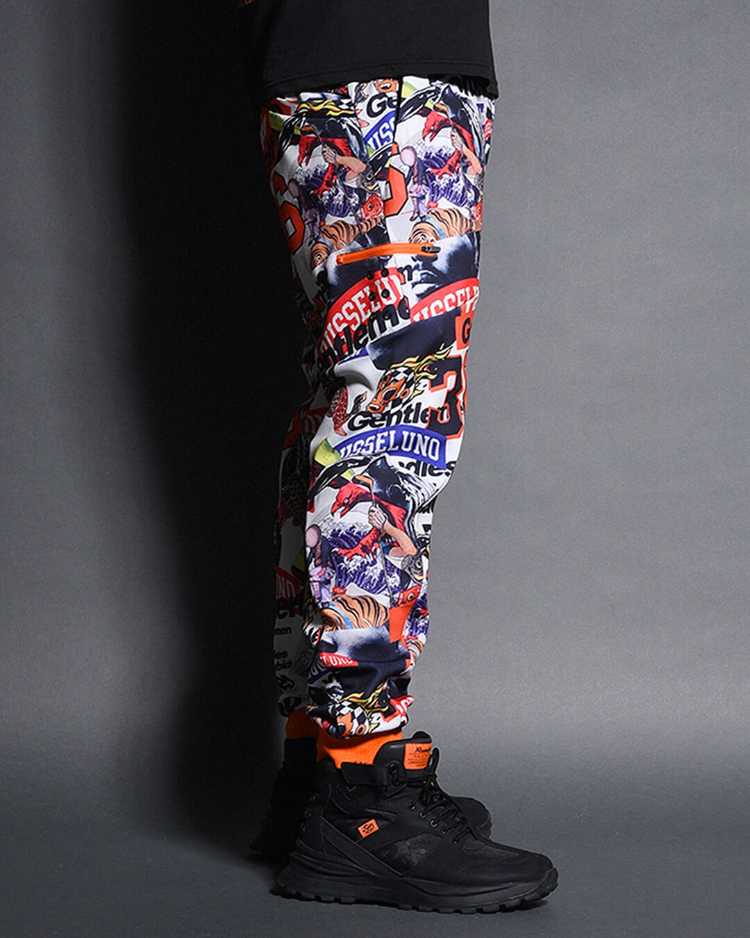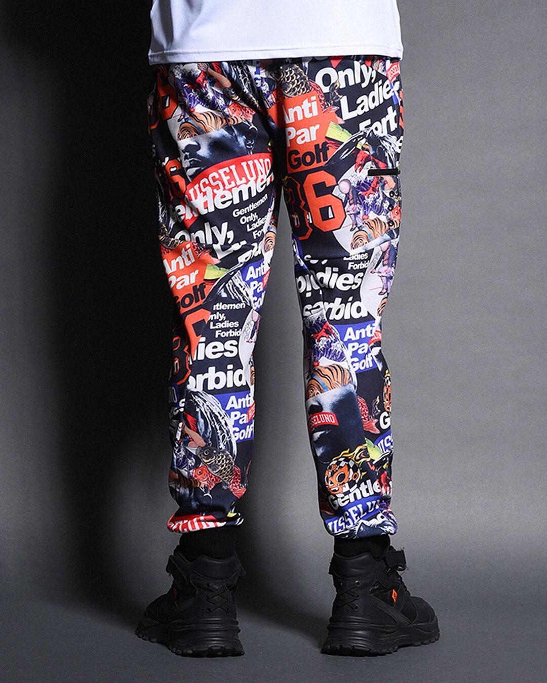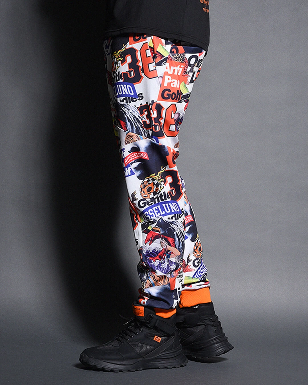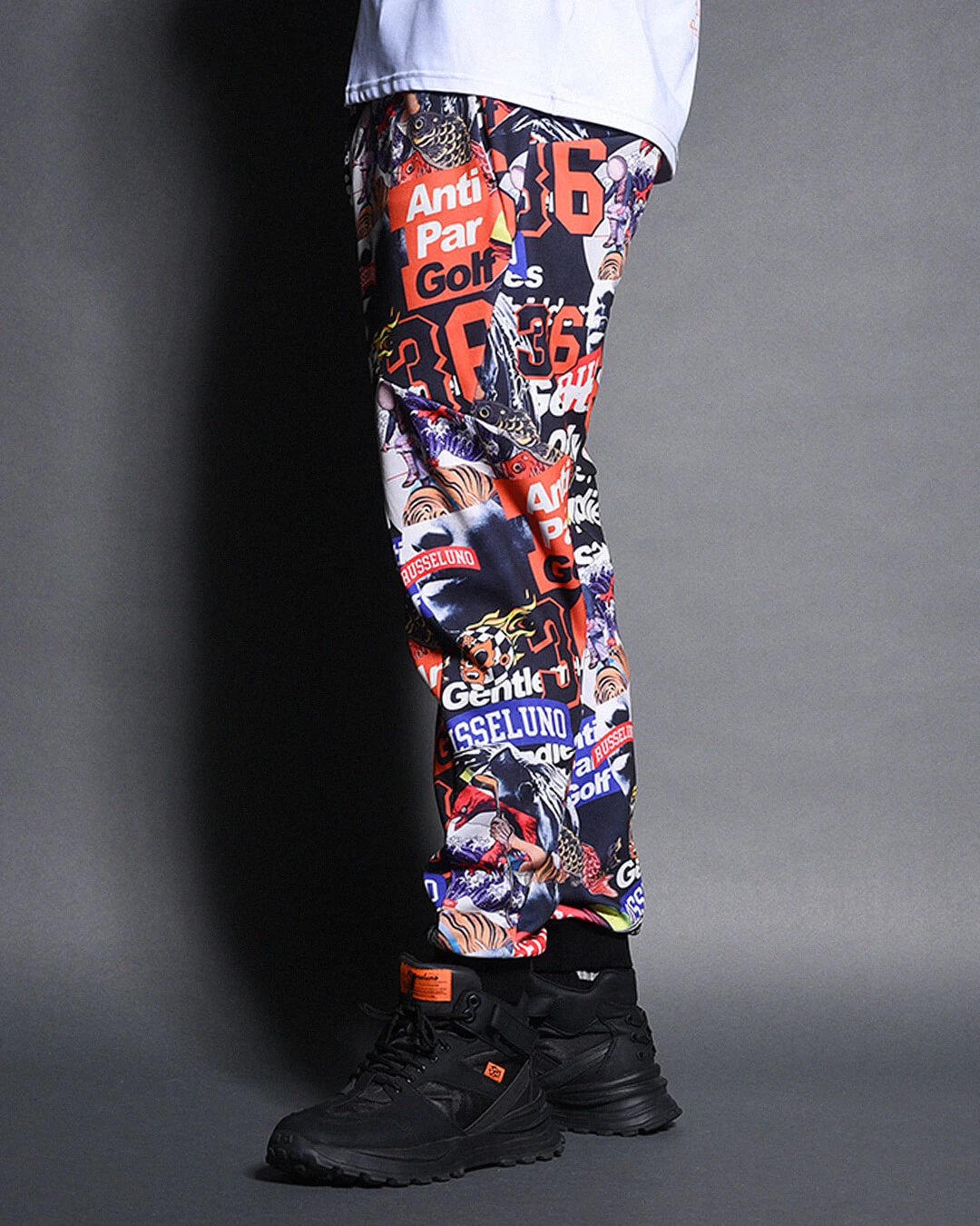 膝下からしっかりとテーパードをかけたシルエットで、ド派手なコラージュグラフィックとスタイリッシュなシルエットの融合が絶妙にマッチするアイテムです。