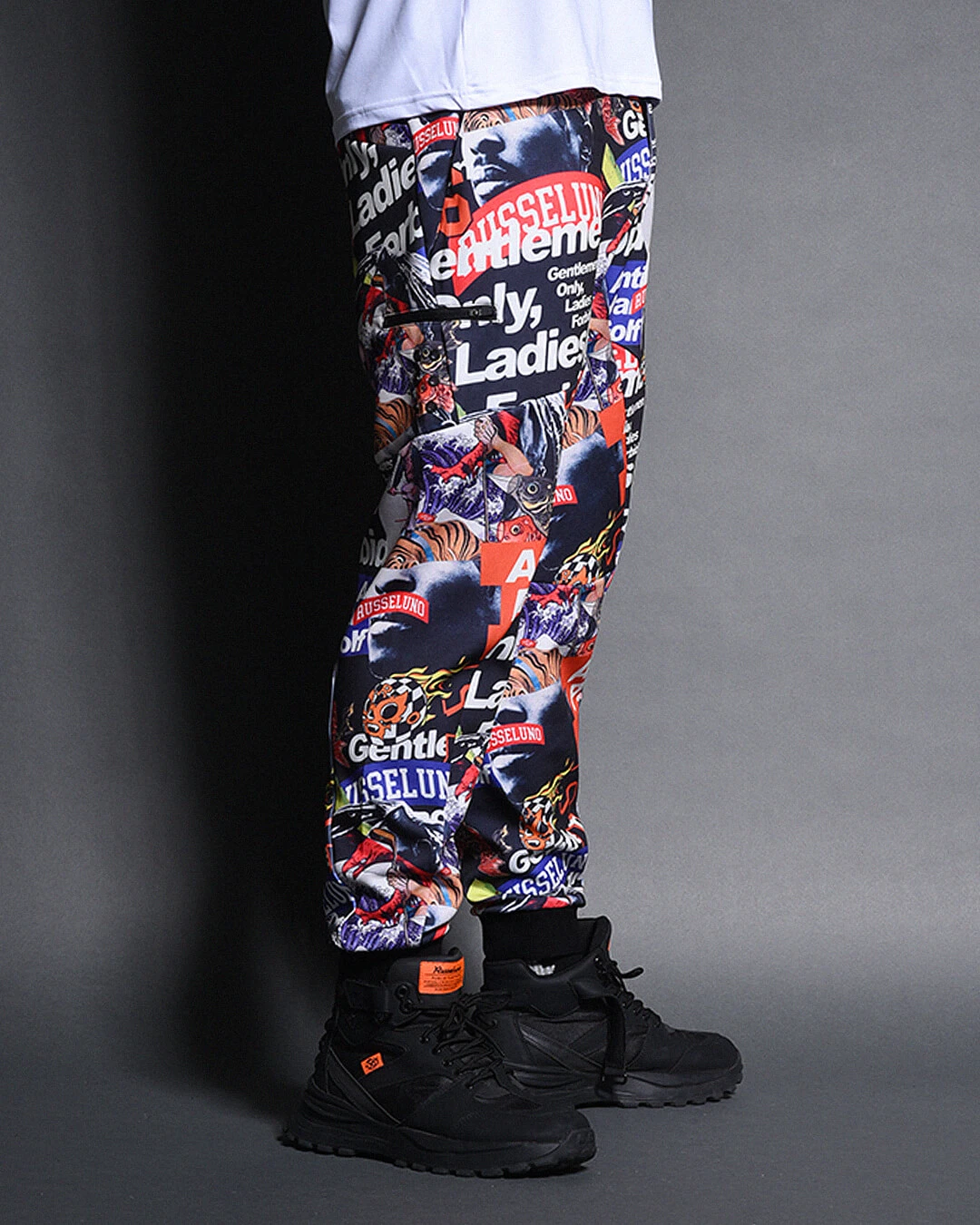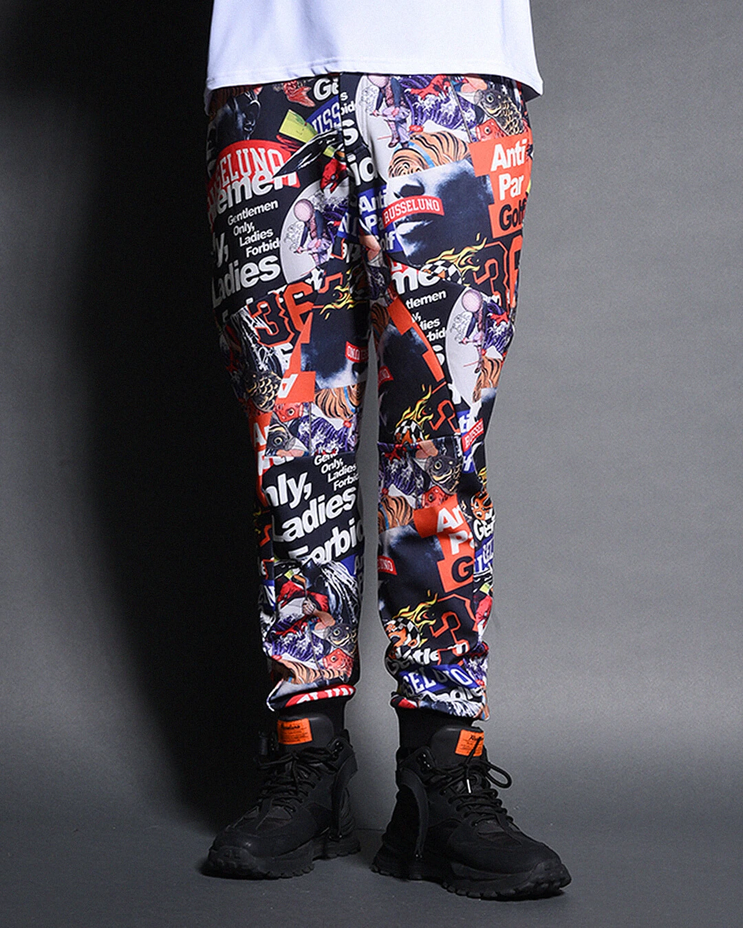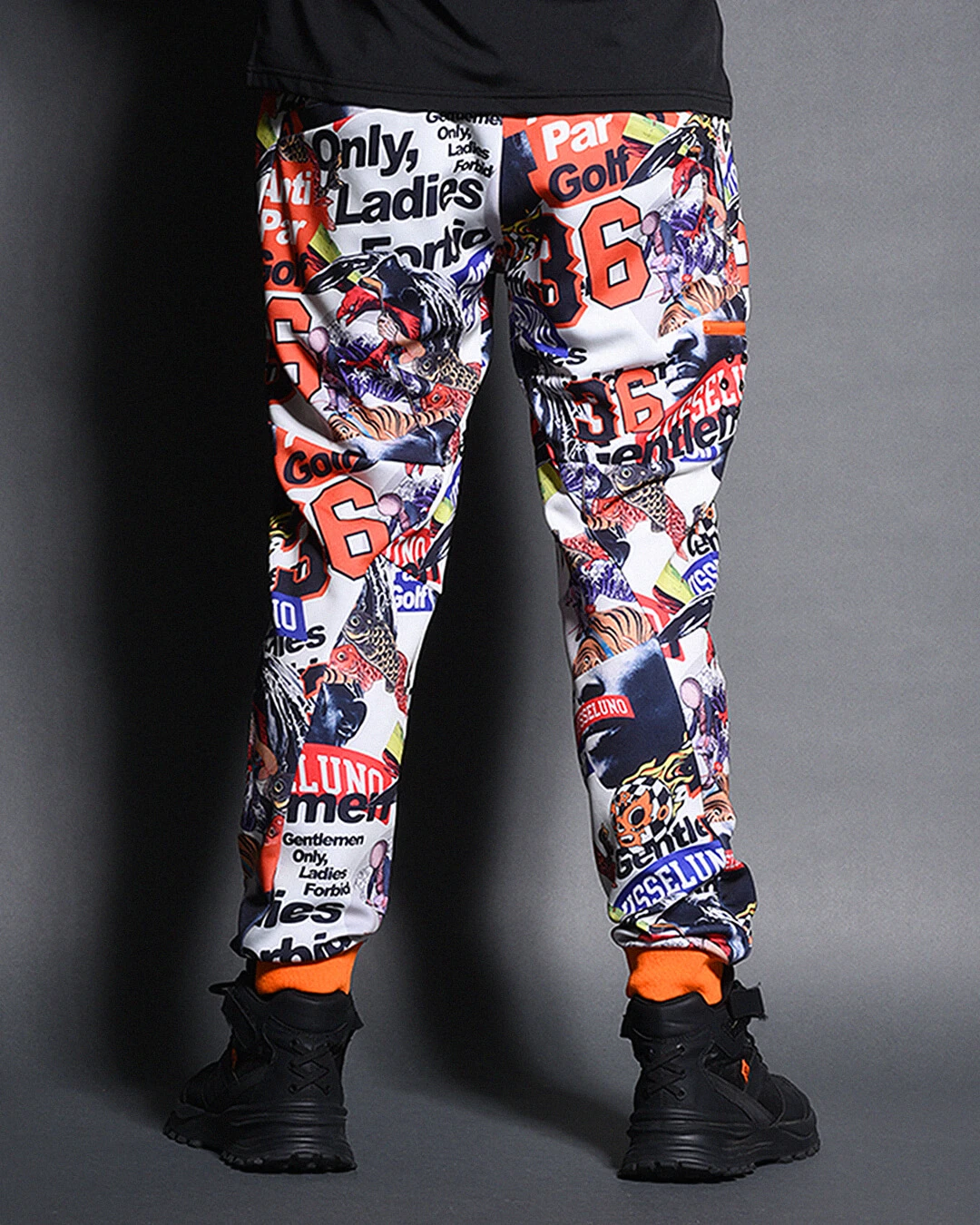 膝下からしっかりとテーパードをかけたシルエットで、ド派手なコラージュグラフィックとスタイリッシュなシルエットの融合が絶妙にマッチするアイテムです。