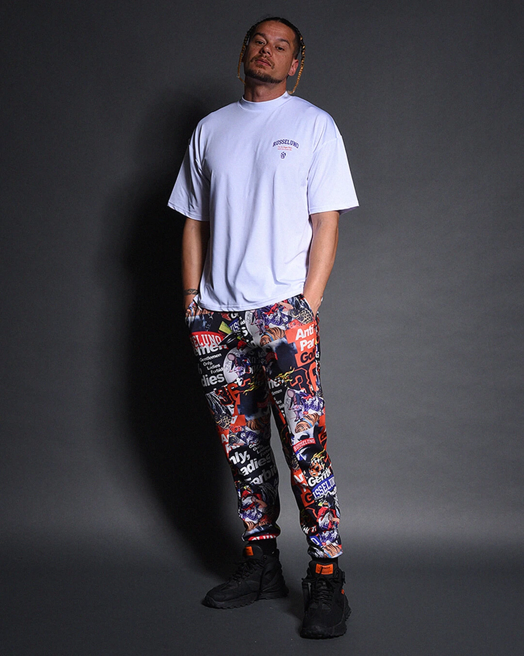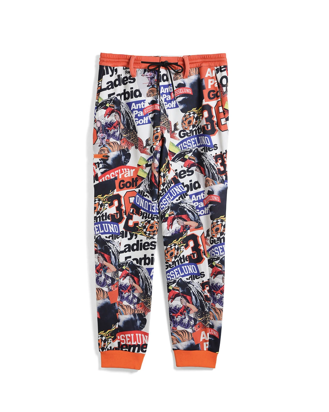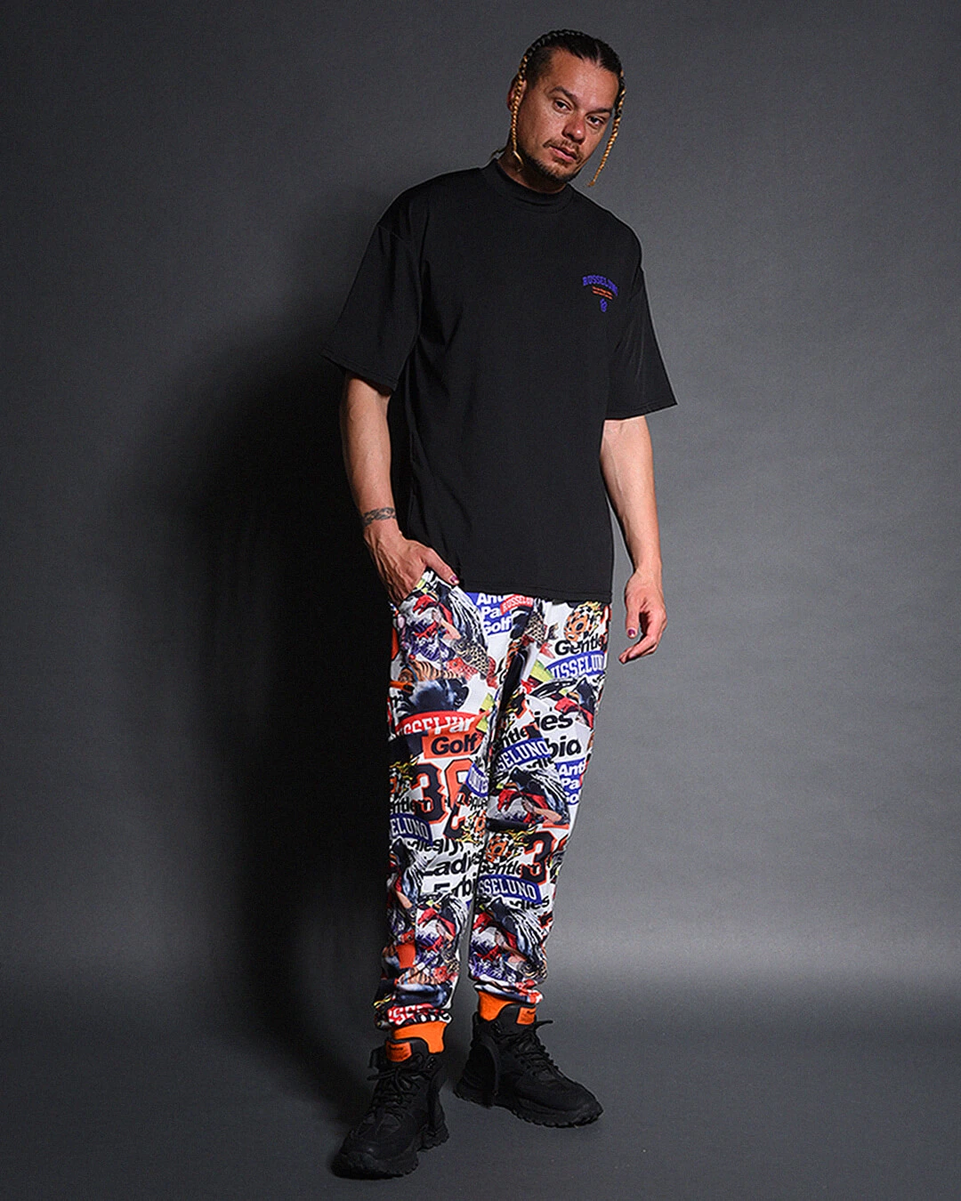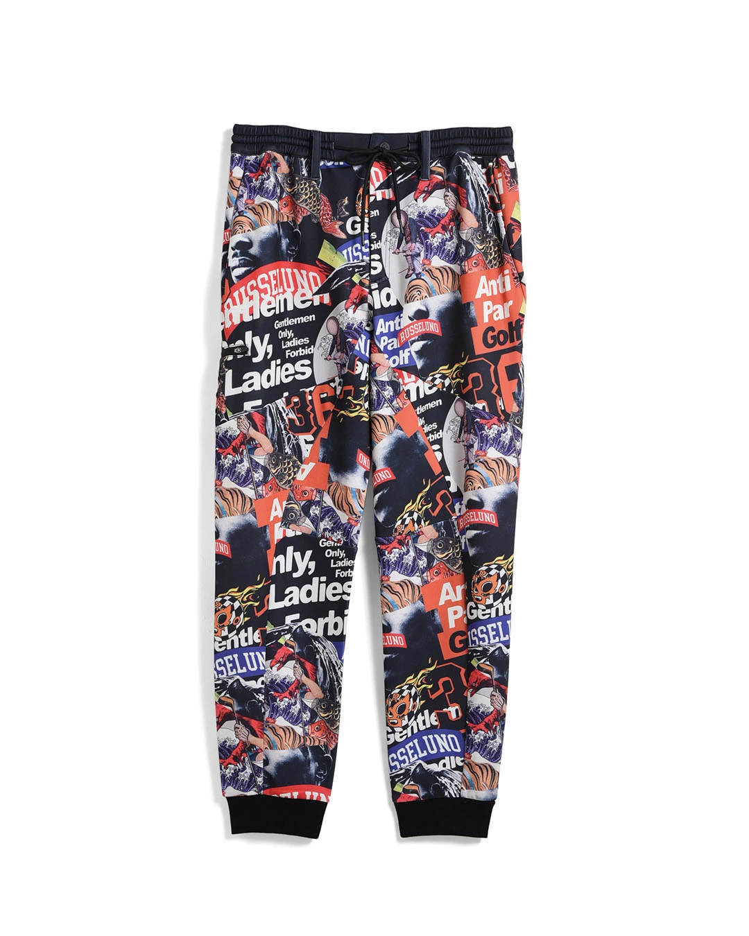 膝下からしっかりとテーパードをかけたシルエットで、ド派手なコラージュグラフィックとスタイリッシュなシルエットの融合が絶妙にマッチするアイテムです。