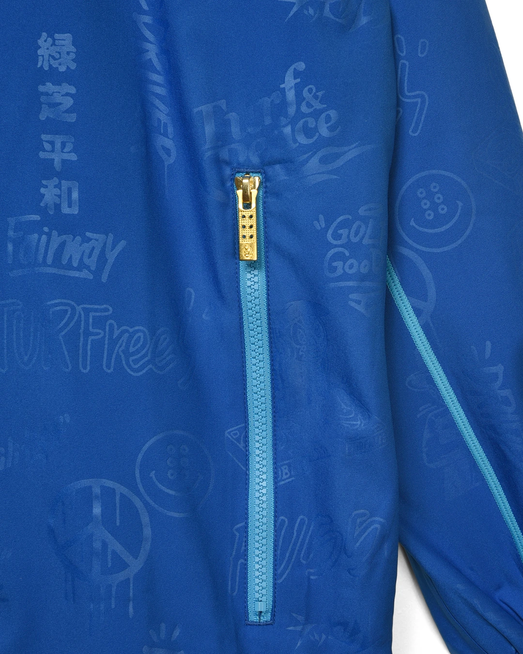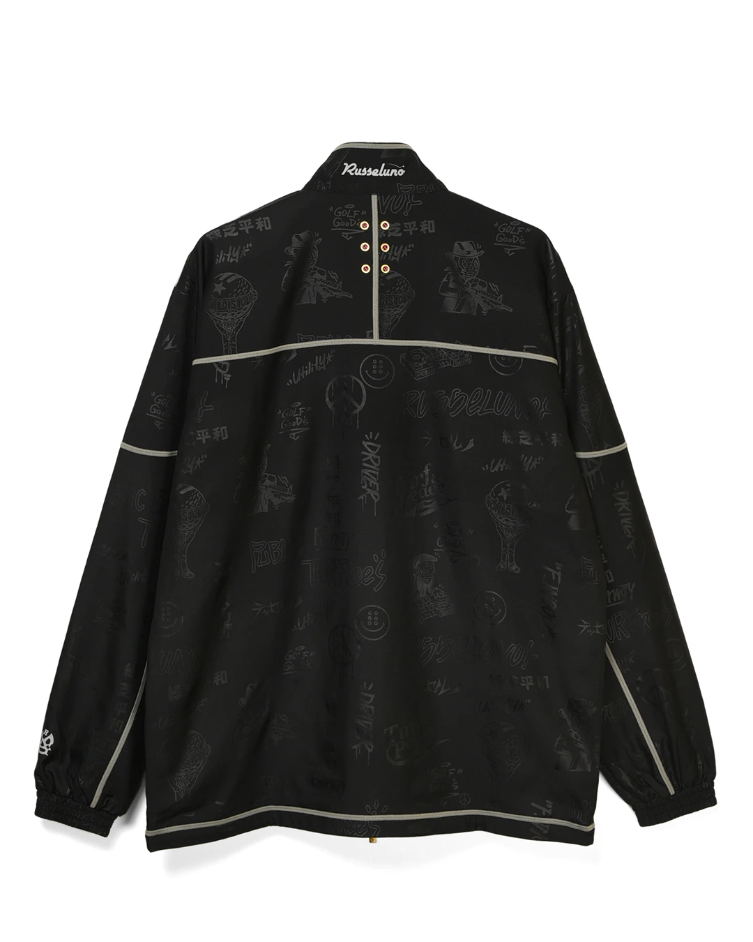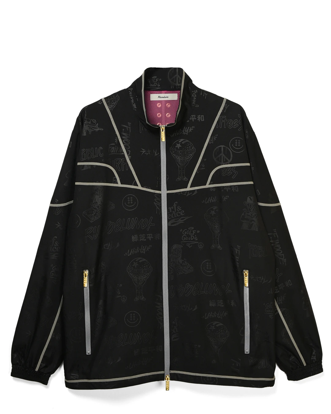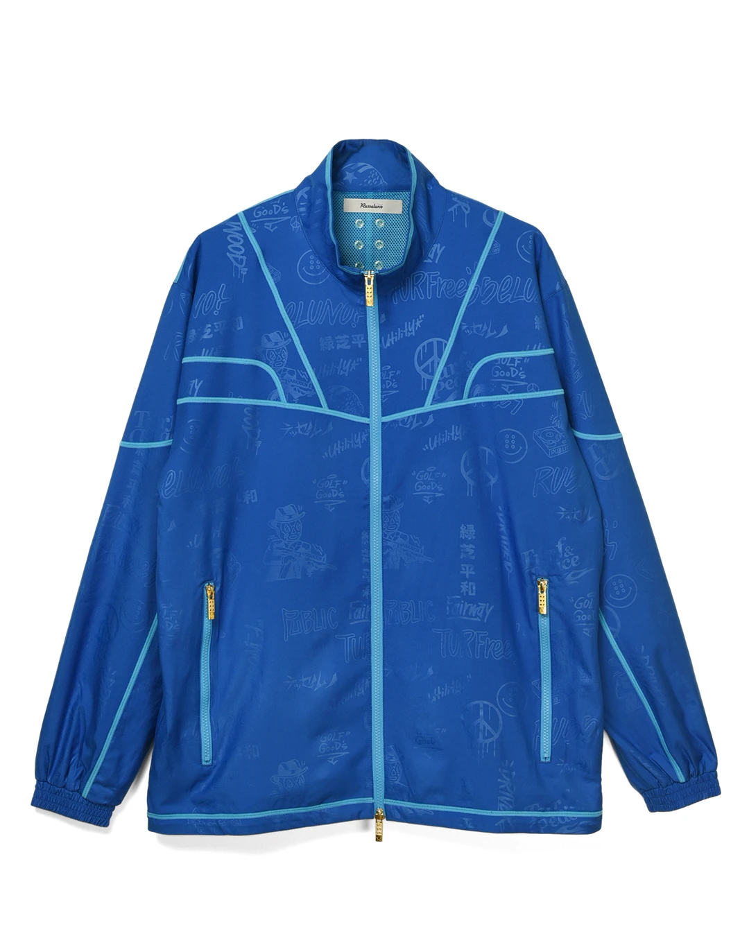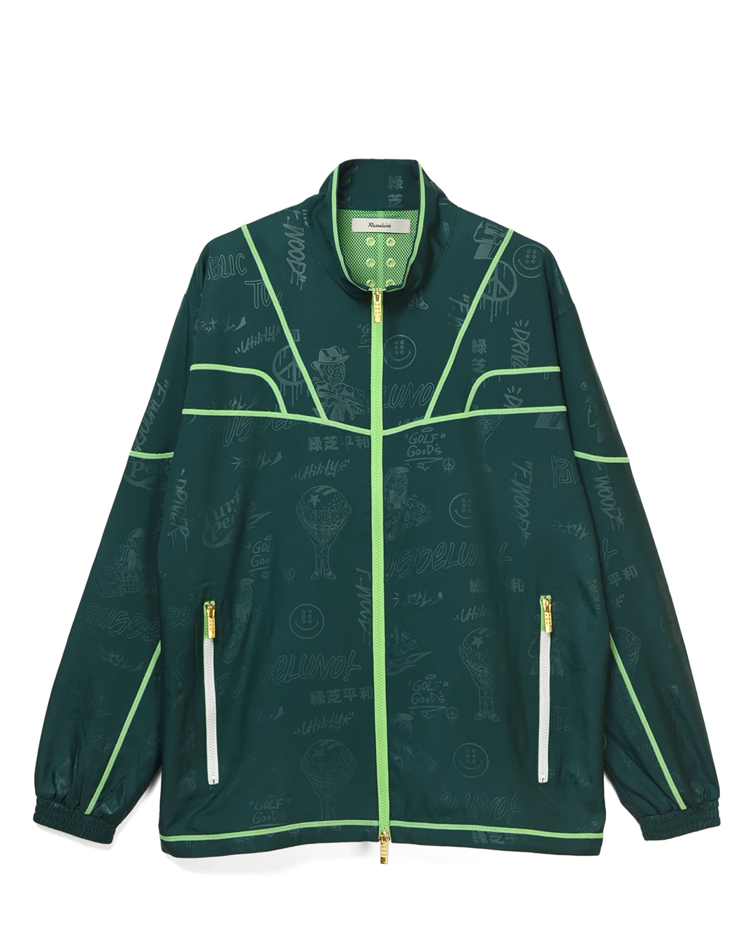 デザイン部分だけを熱で溶かし、陰影のみで柄表現するシレーエンボス加工を使用した総柄パターン生地をボディーに使用したジップブルゾン。