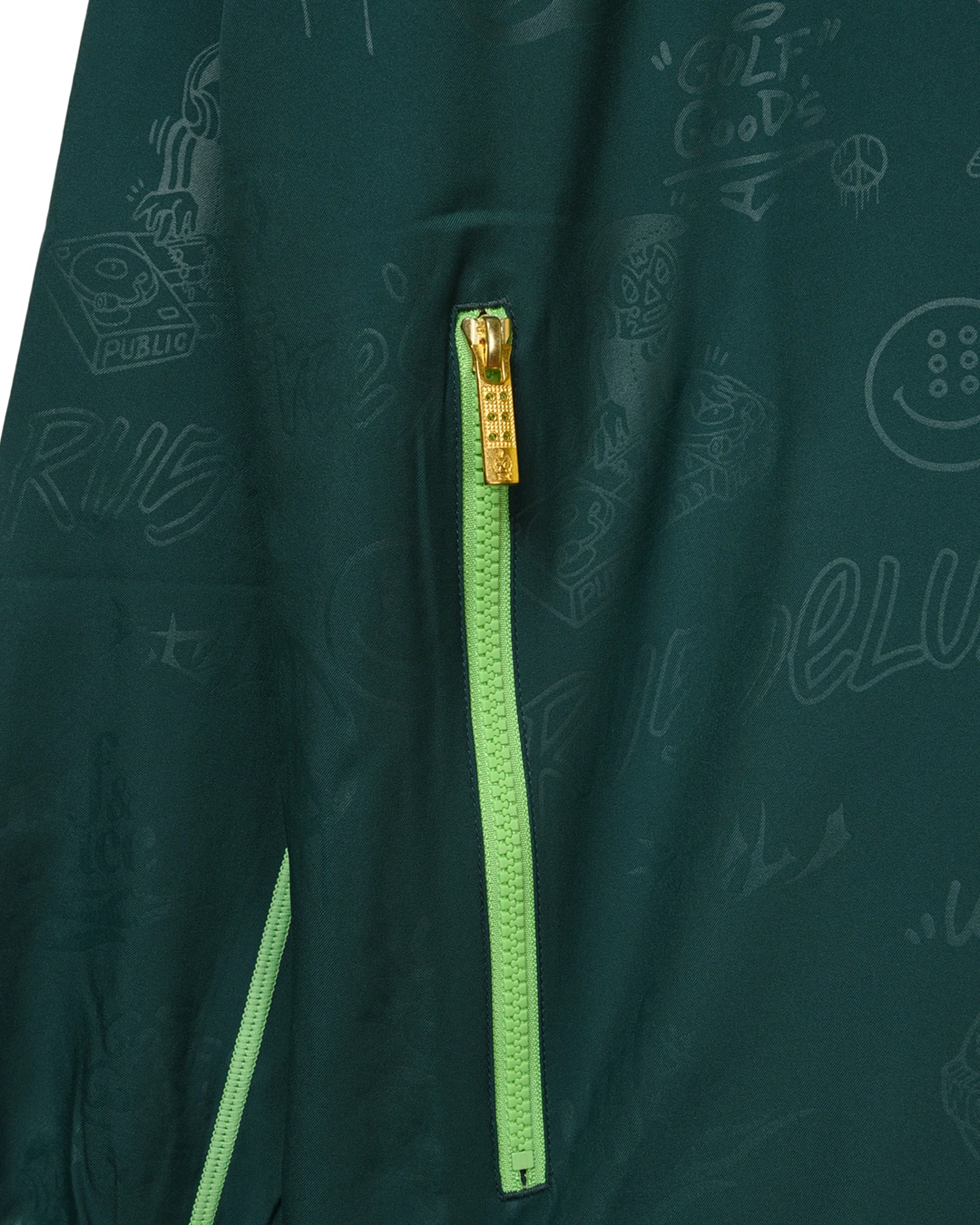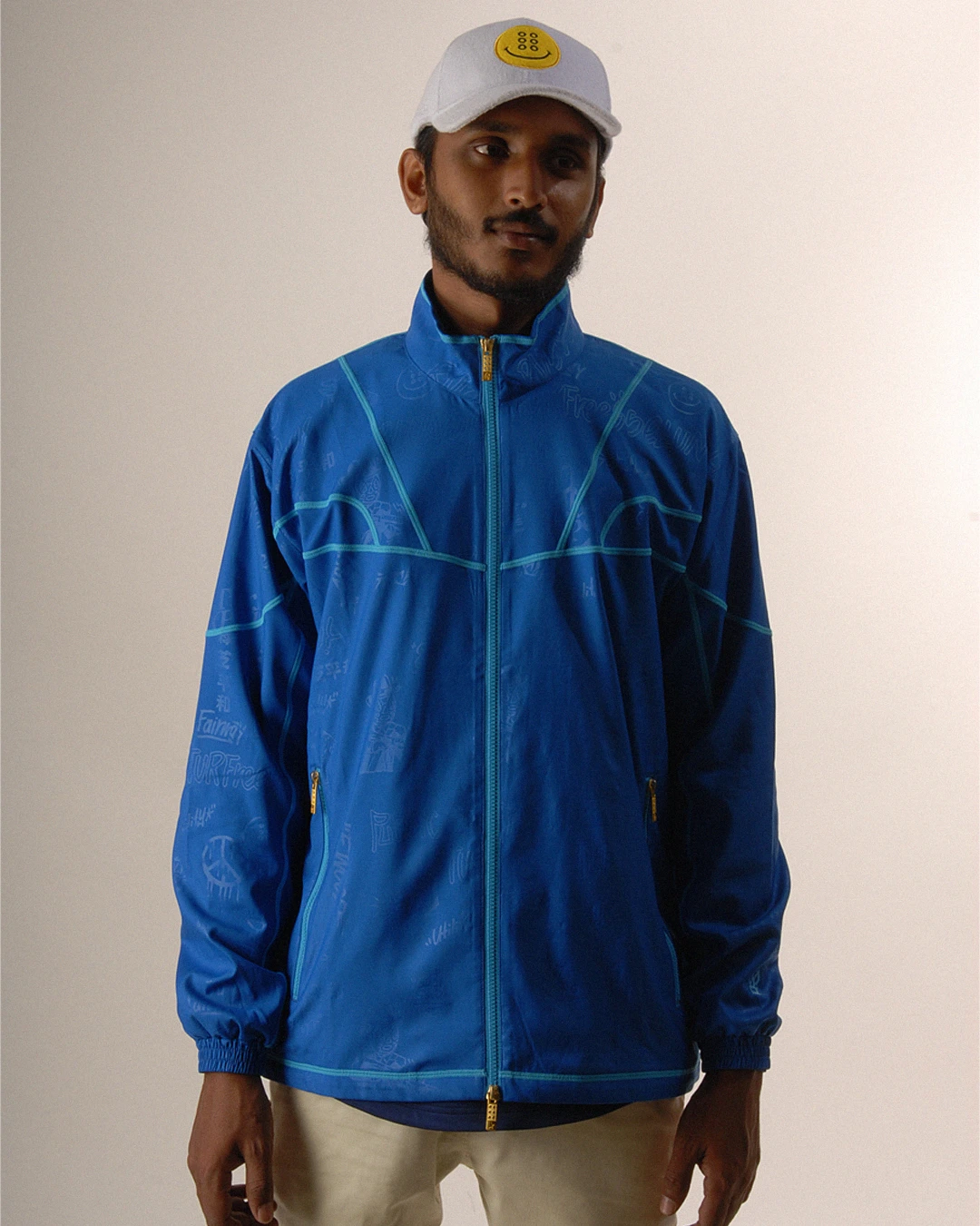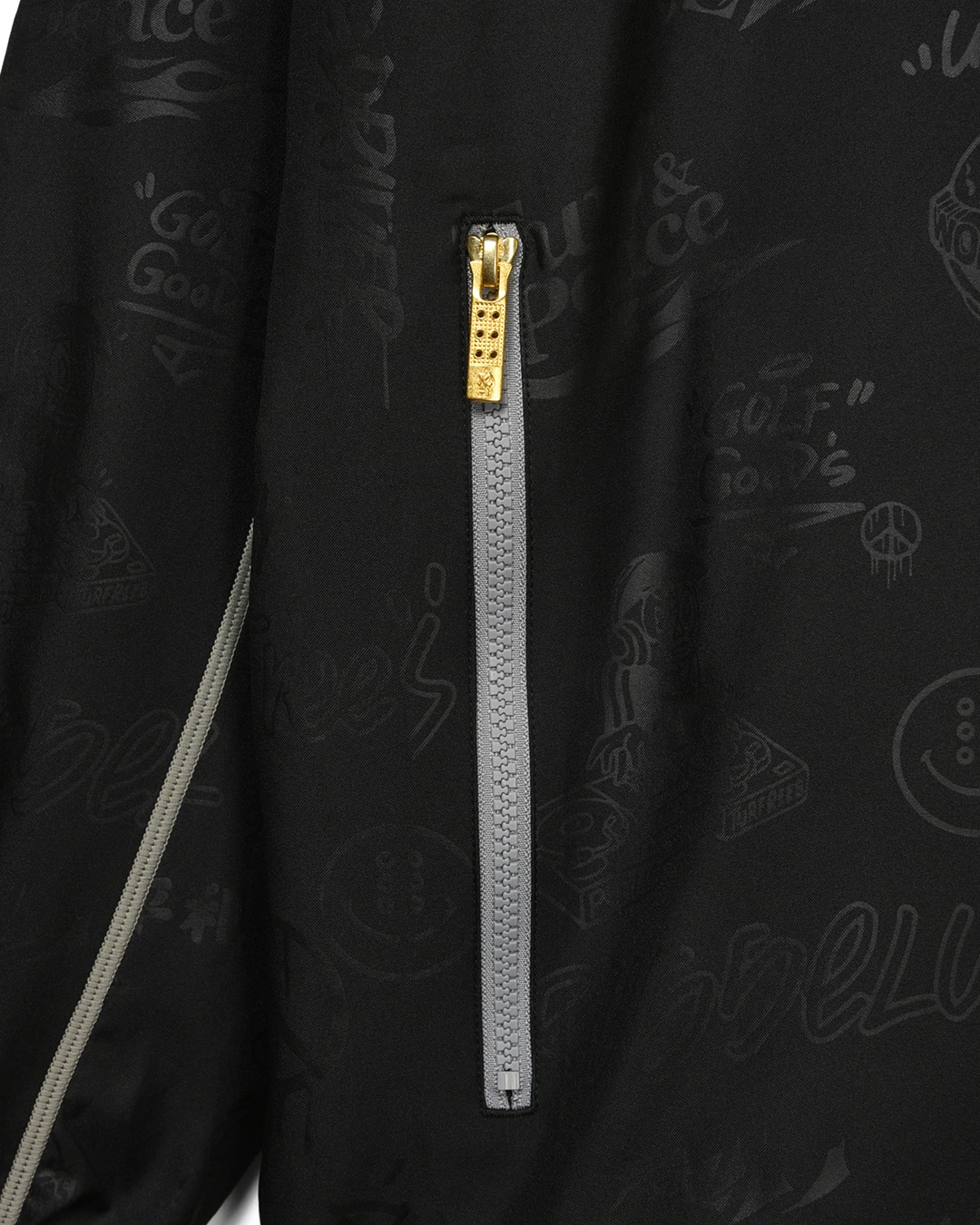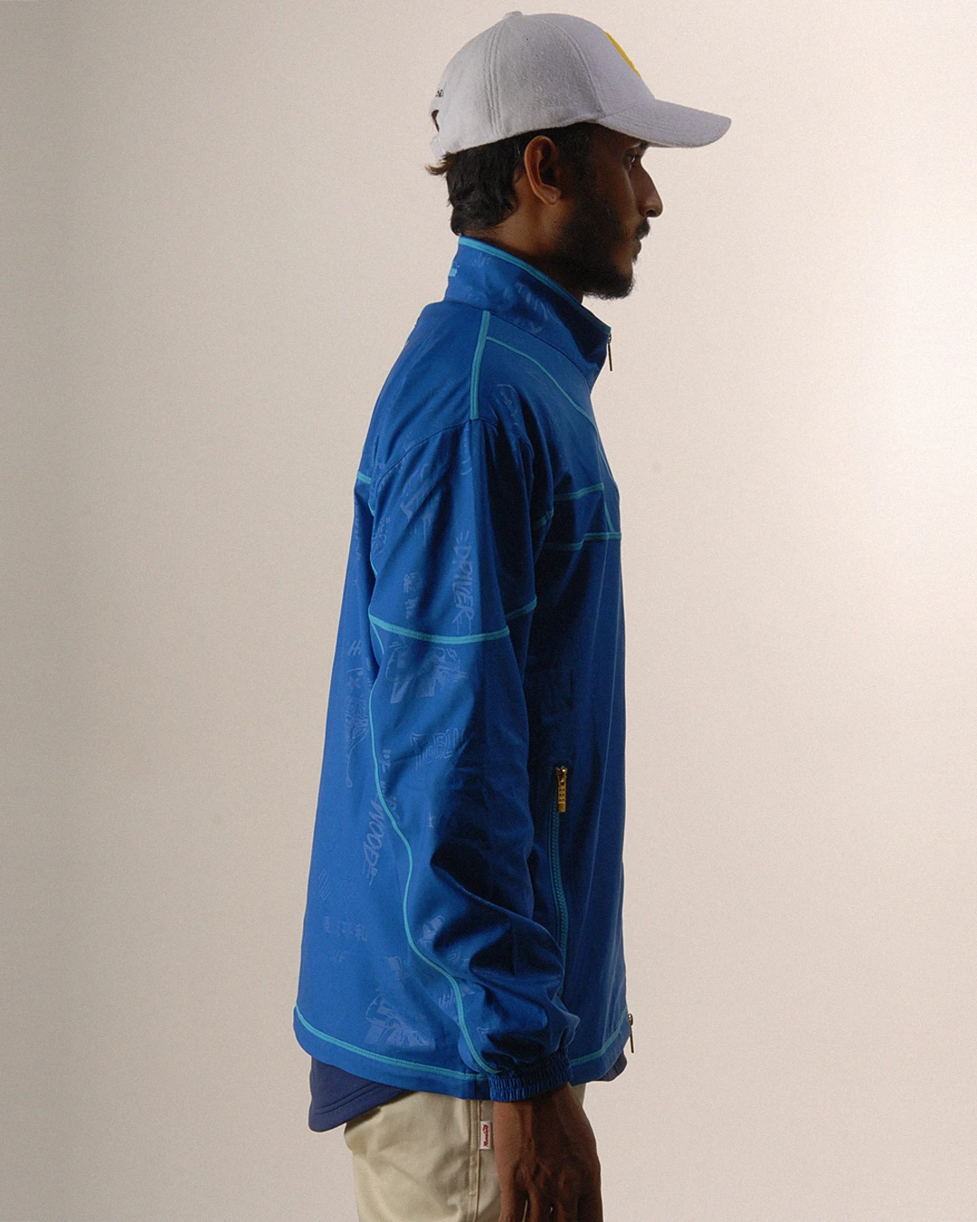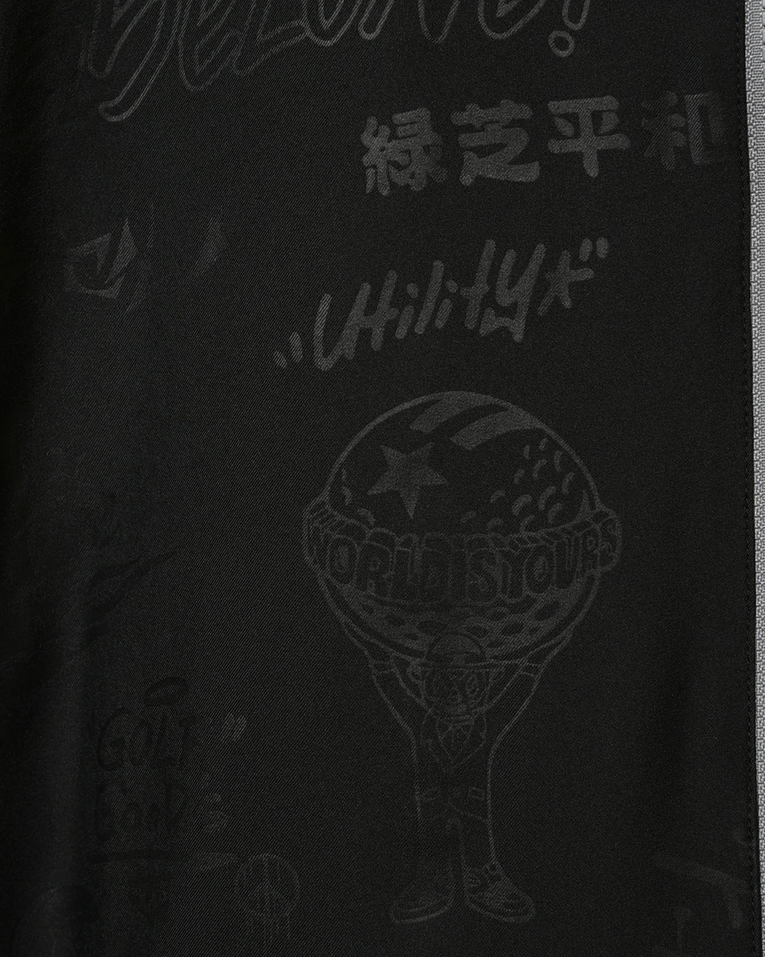 デザイン部分だけを熱で溶かし、陰影のみで柄表現するシレーエンボス加工を使用した総柄パターン生地をボディーに使用したジップブルゾン。