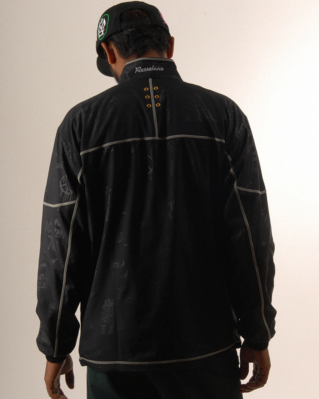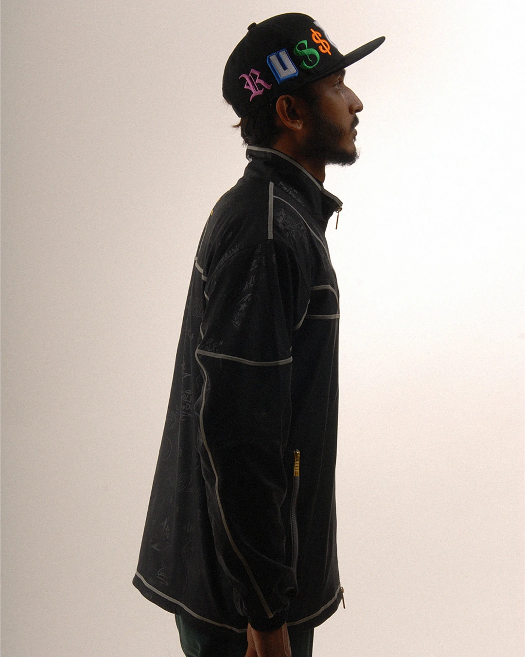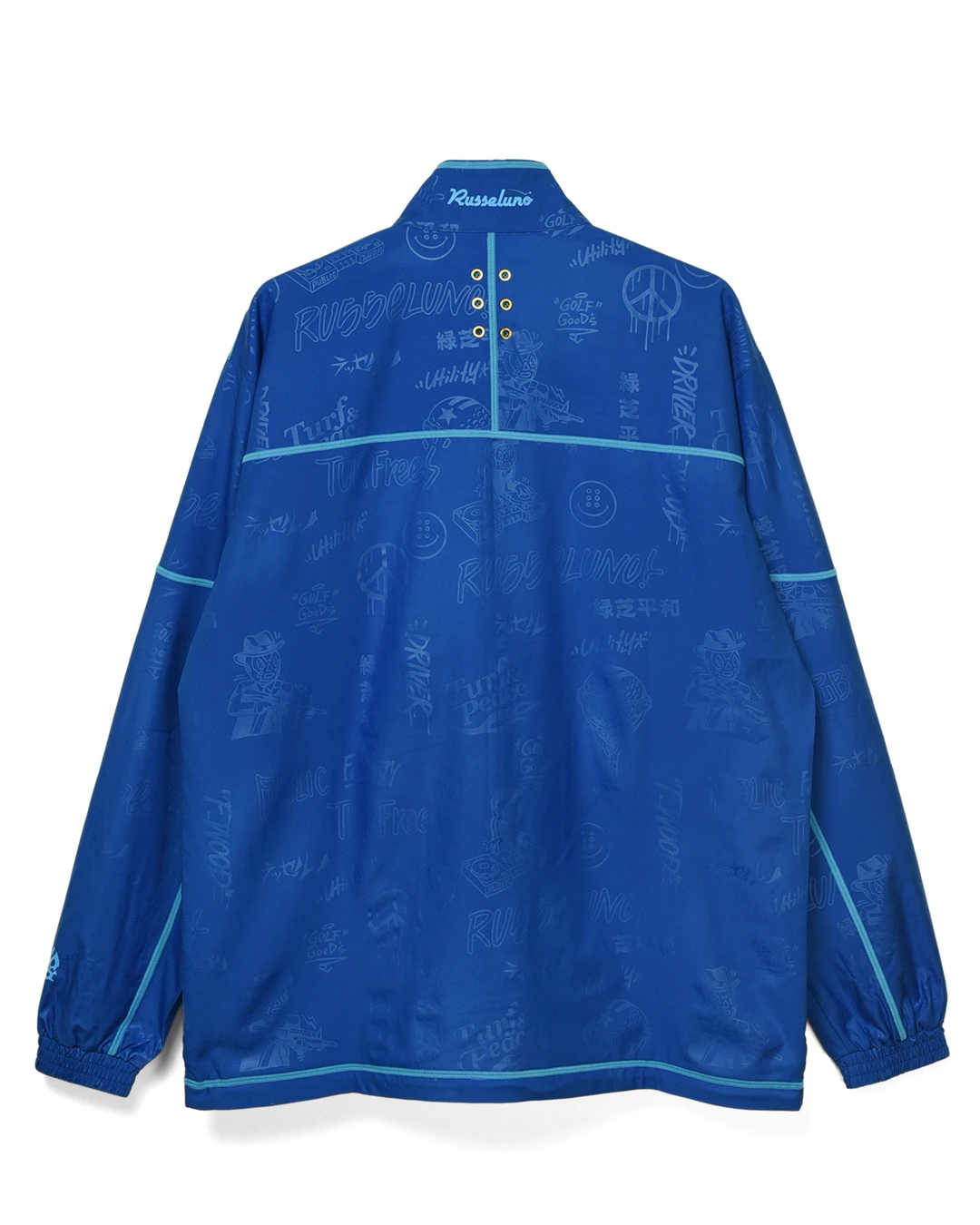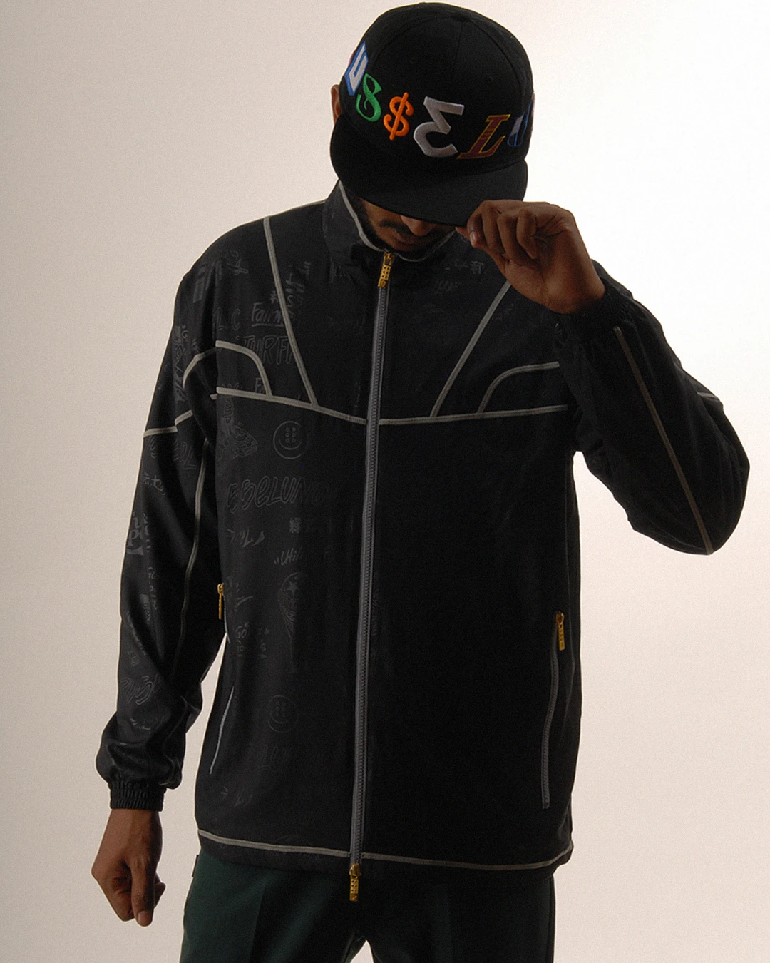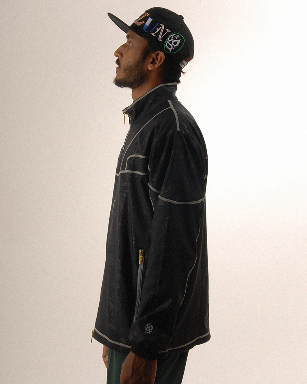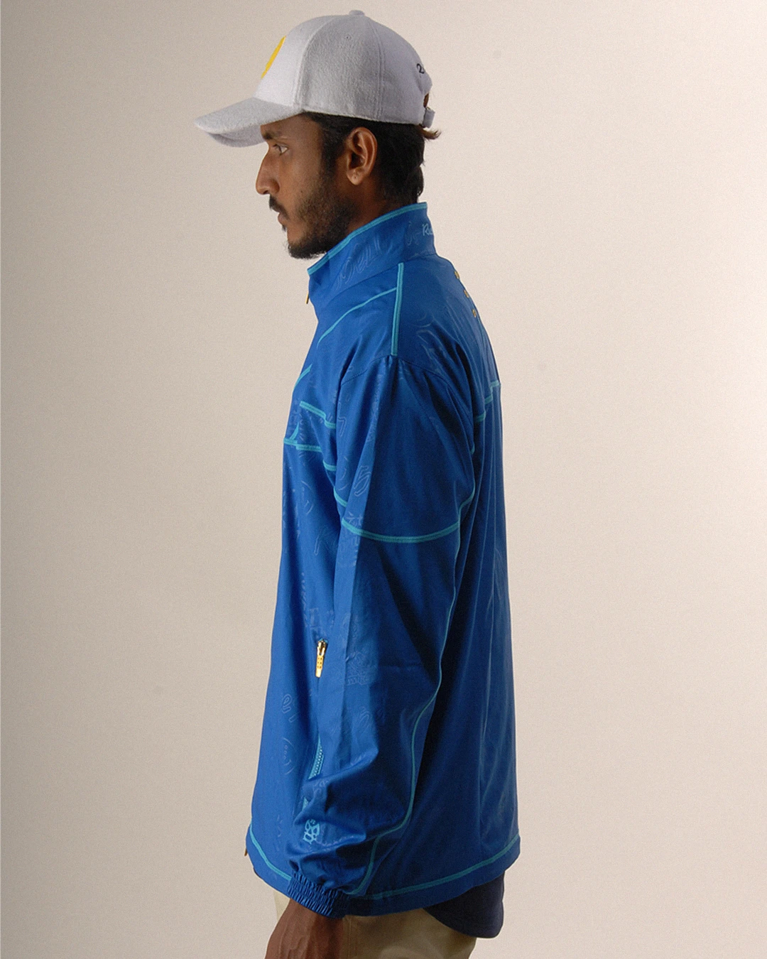 デザイン部分だけを熱で溶かし、陰影のみで柄表現するシレーエンボス加工を使用した総柄パターン生地をボディーに使用したジップブルゾン。