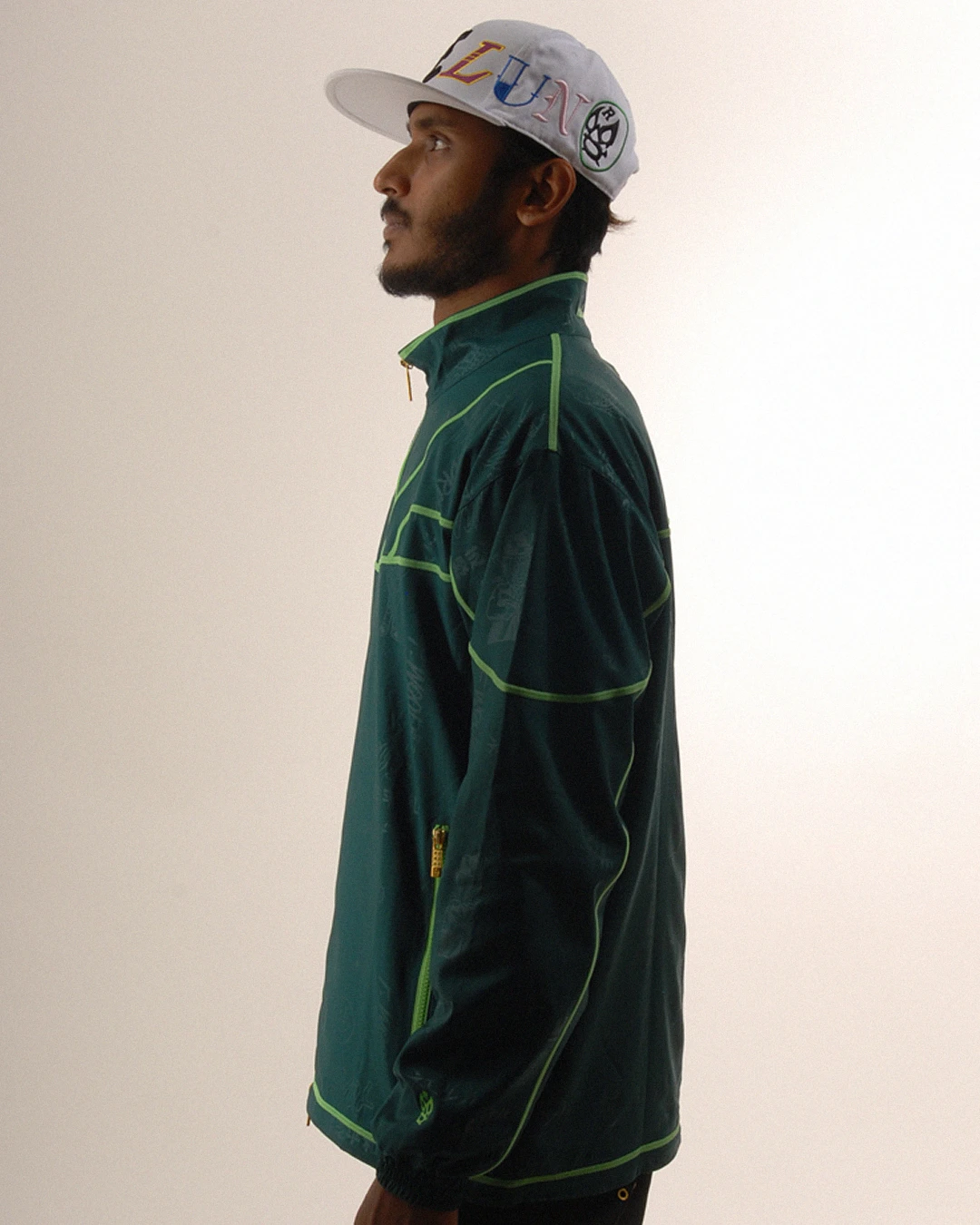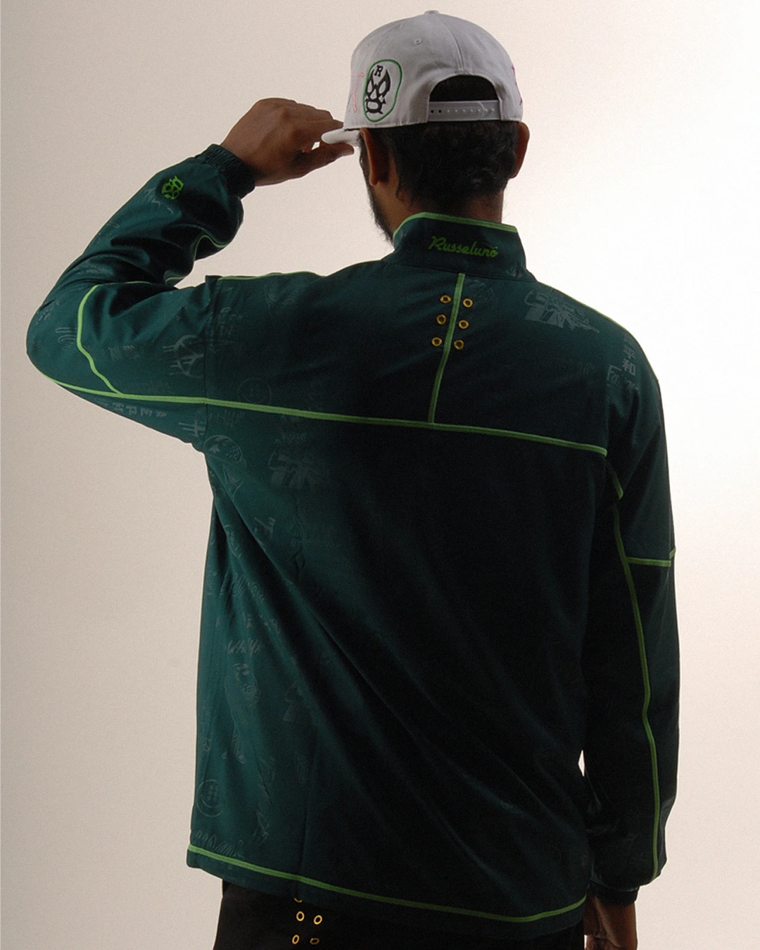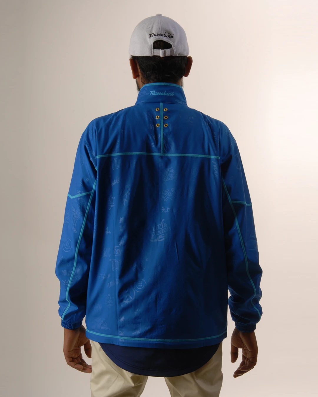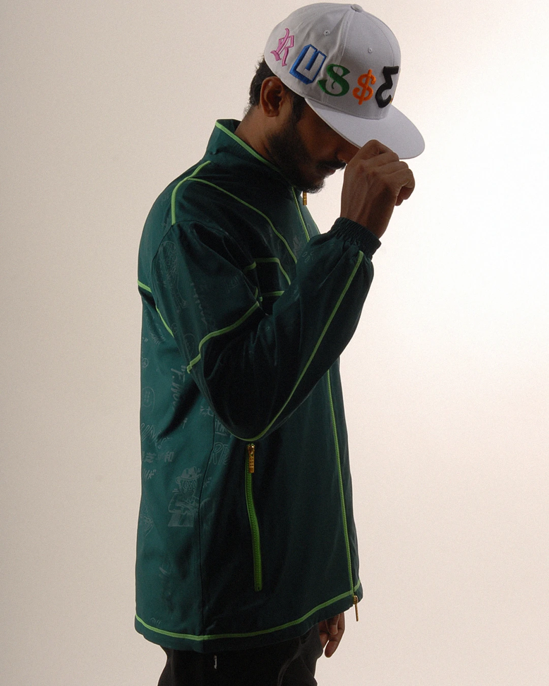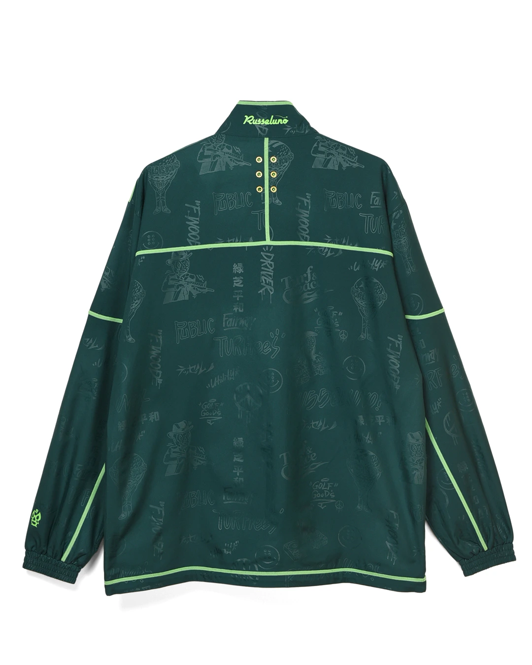 デザイン部分だけを熱で溶かし、陰影のみで柄表現するシレーエンボス加工を使用した総柄パターン生地をボディーに使用したジップブルゾン。