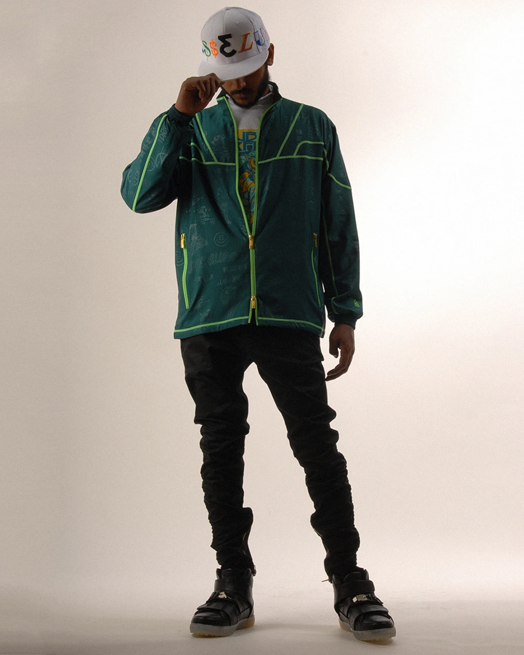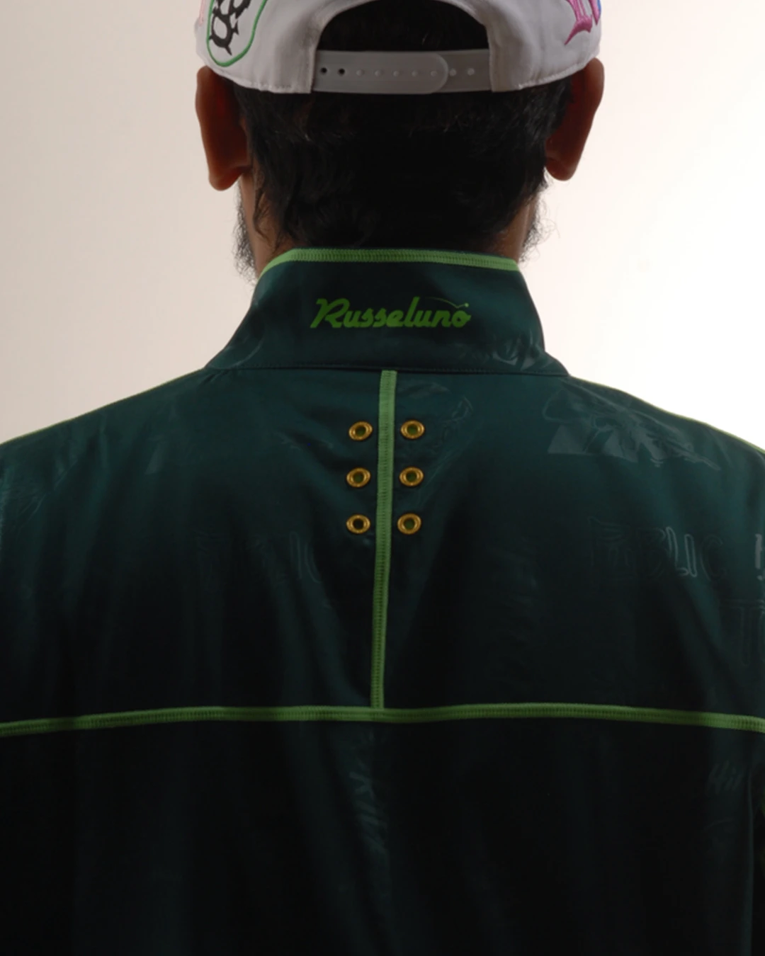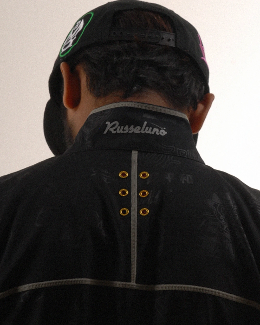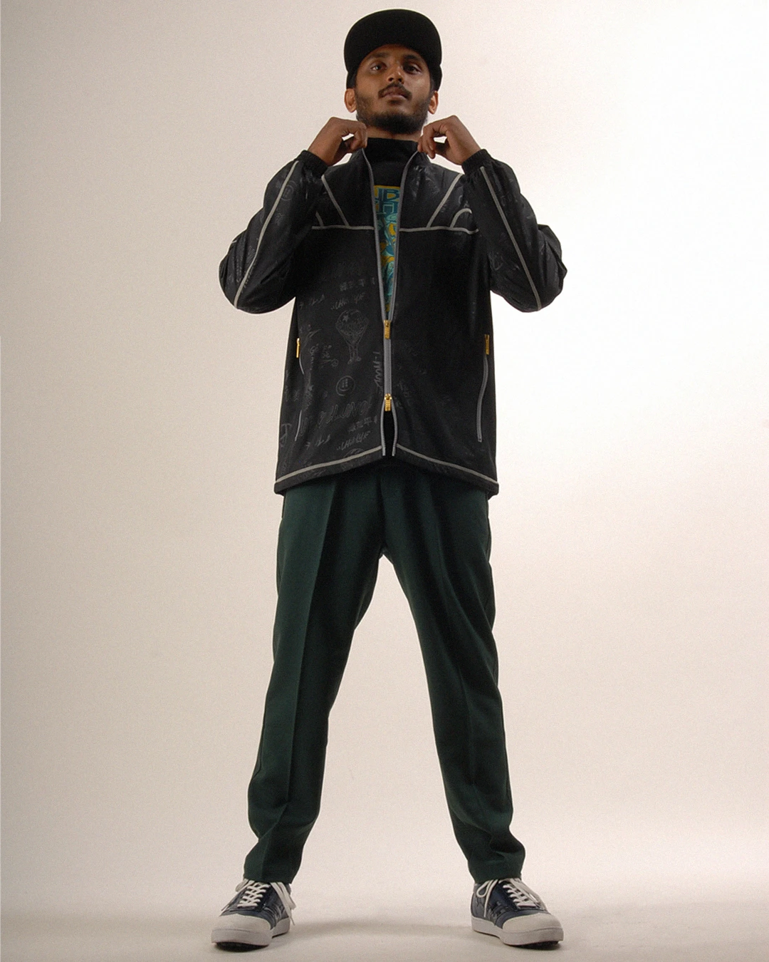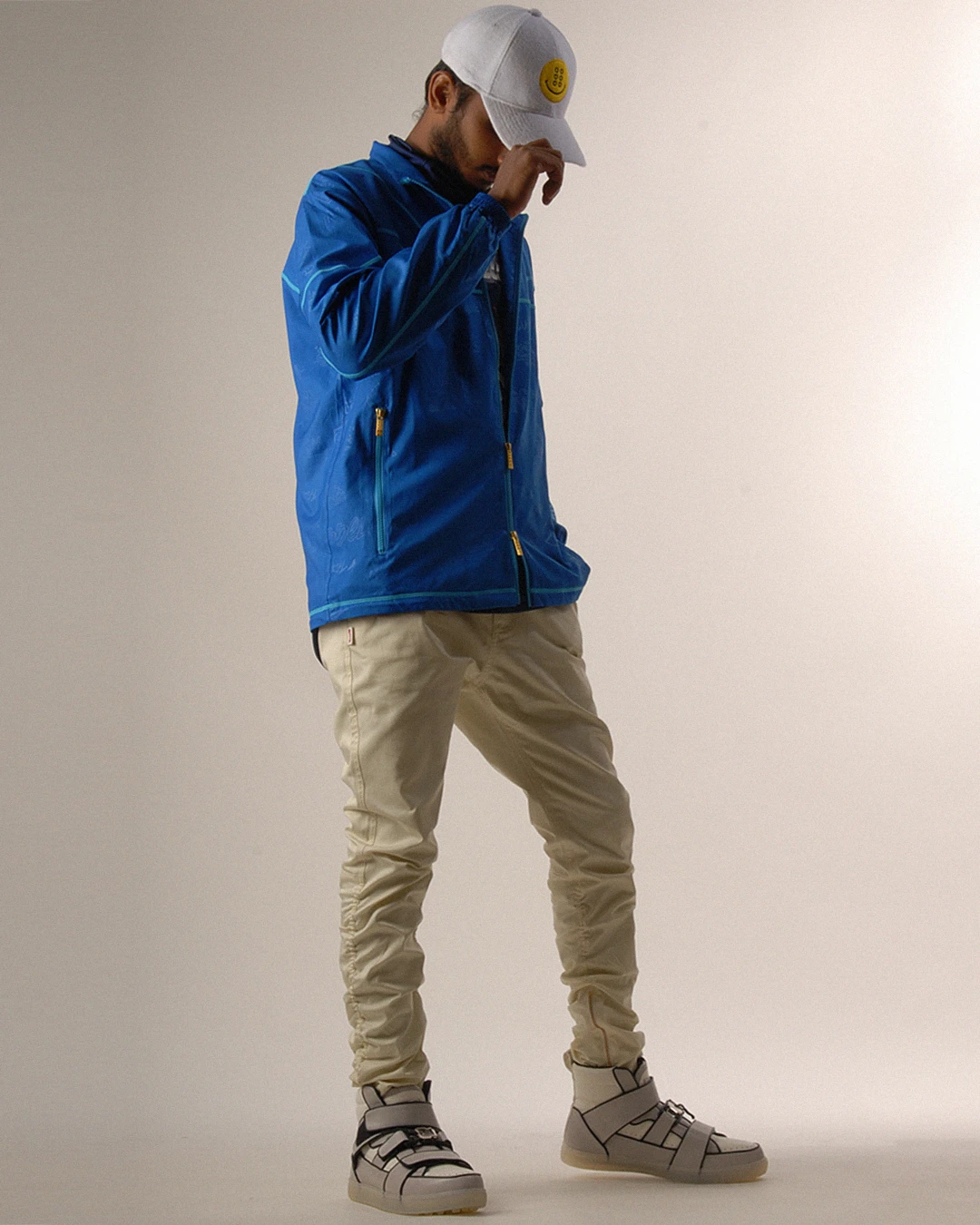 デザイン部分だけを熱で溶かし、陰影のみで柄表現するシレーエンボス加工を使用した総柄パターン生地をボディーに使用したジップブルゾン。