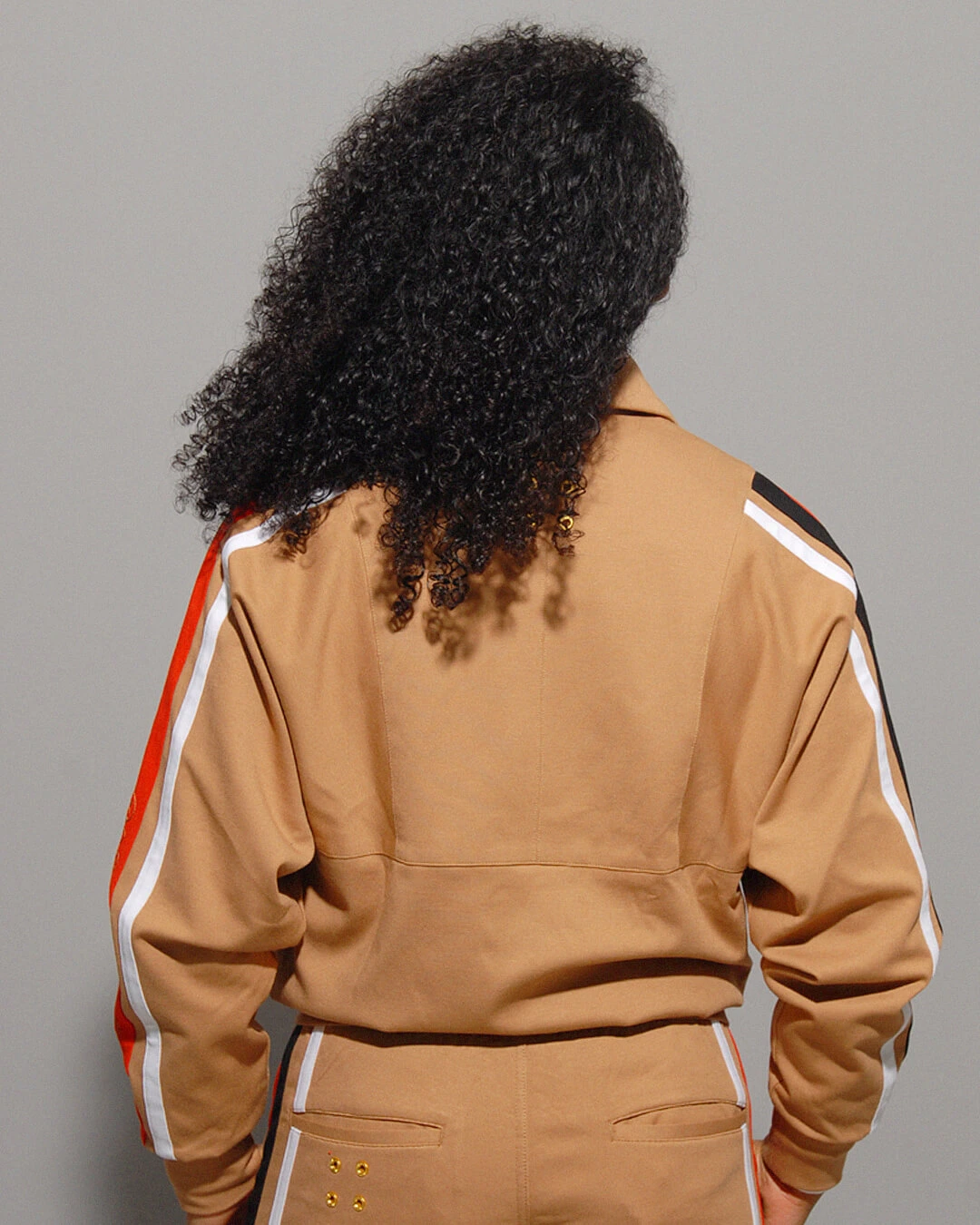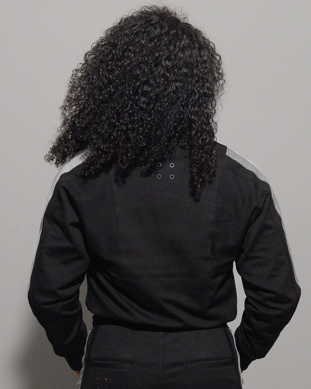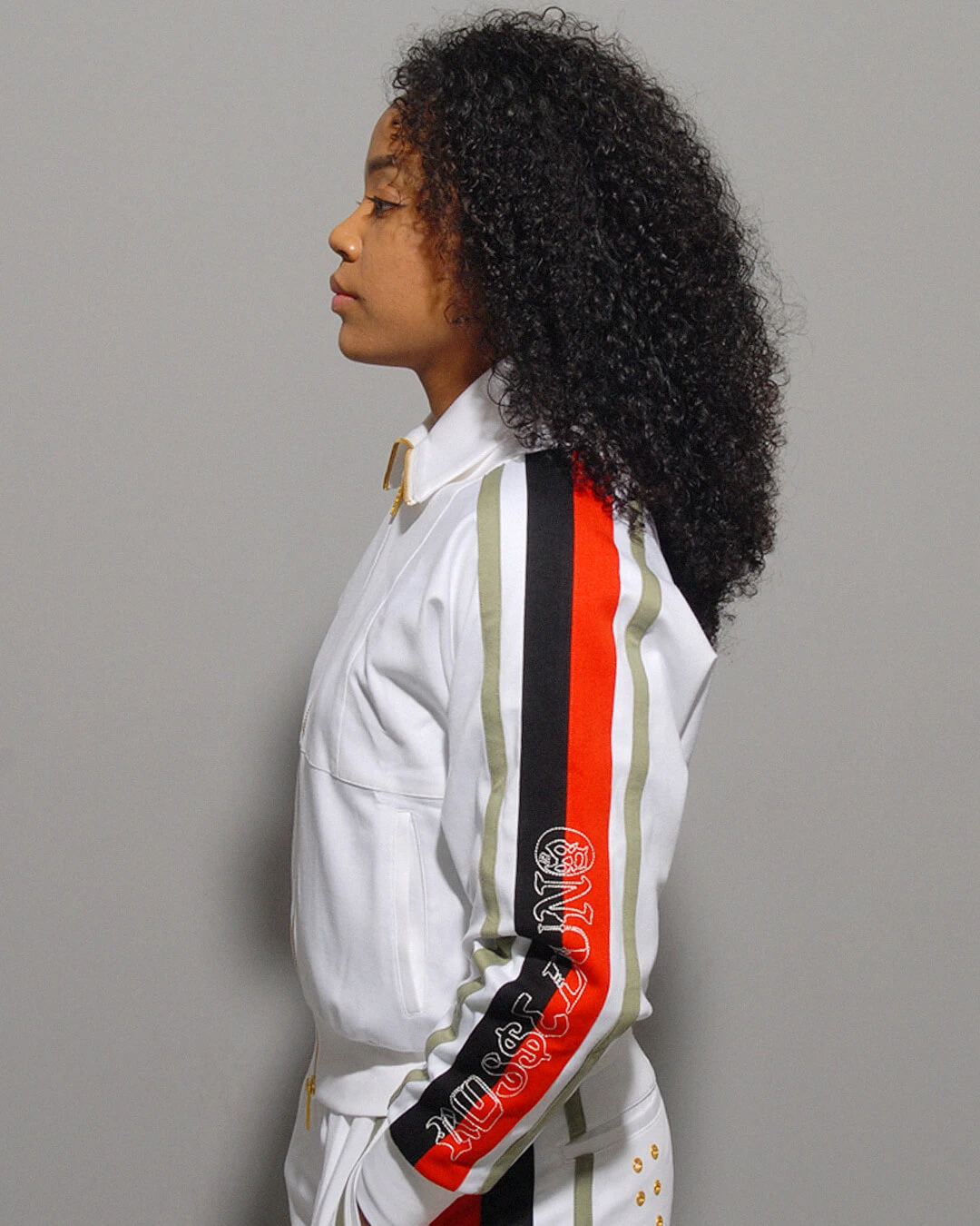 切り替えとグラデーションプリントを組み合わせた大胆な袖のラインには、クレイジーイニシャルロゴの刺繍が入ります。