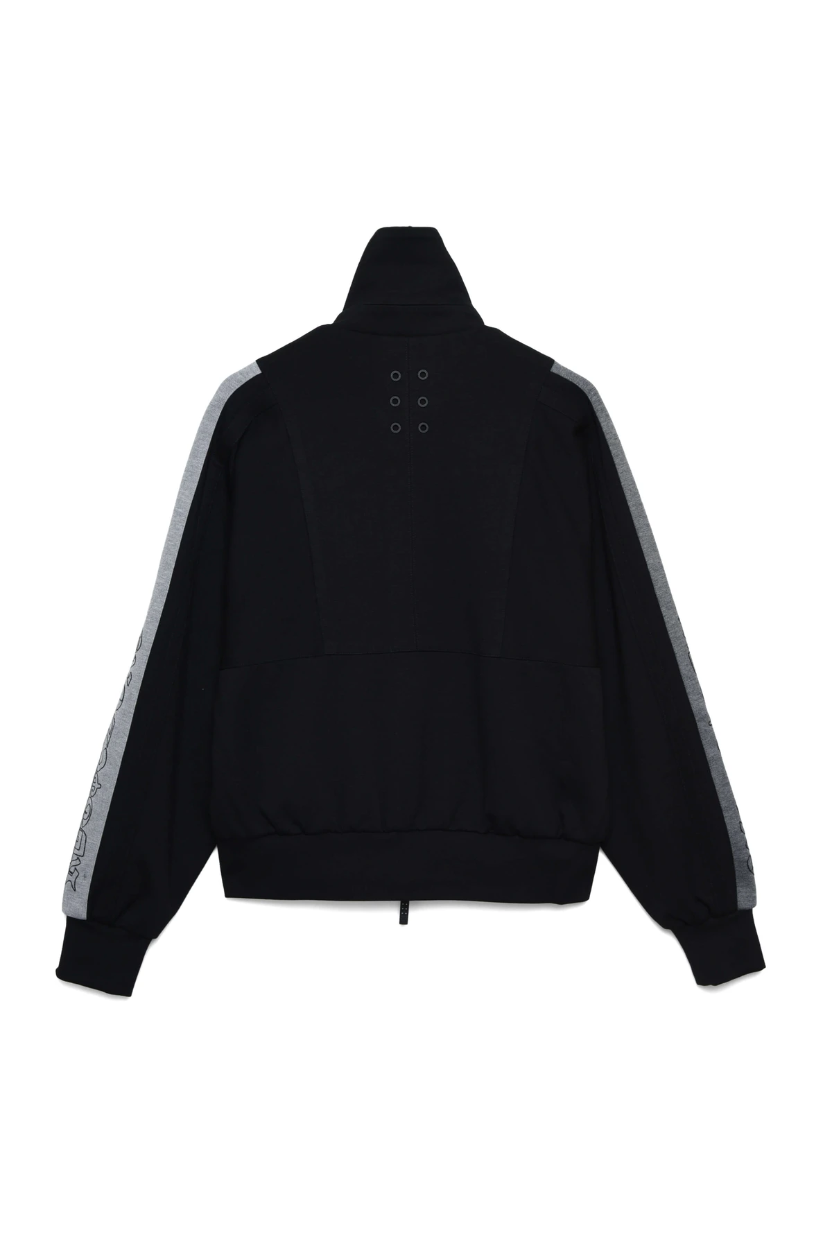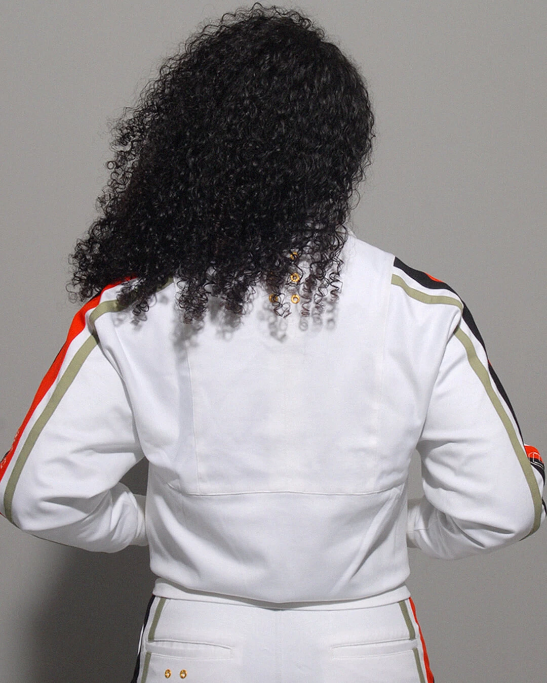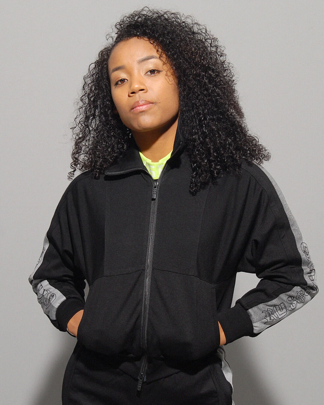 切り替えとグラデーションプリントを組み合わせた大胆な袖のラインには、クレイジーイニシャルロゴの刺繍が入ります。